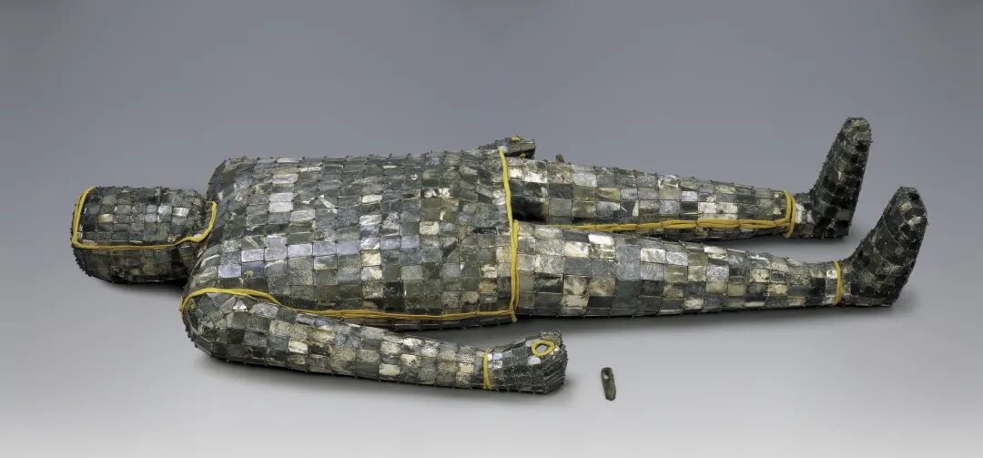 整件由头套、双臂、双手、胸背、双腿及双足等部件分体制作组成,各部件以丝织物包边,银缕串缀。玉衣多由方形、长方形及梯形玉片组成,共用玉片2216片。