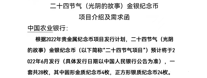 近日,网上流传着一张24节气金银纪念币的项目介绍,预计6月发行,包含4枚金币和24枚银币共28枚。