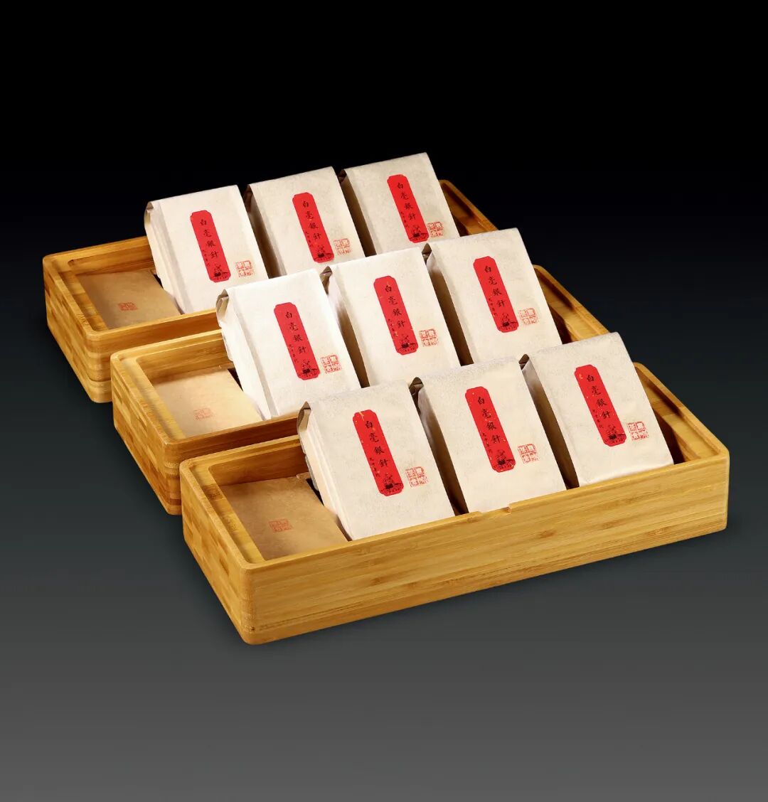 白毫银针,创制于1796年,属于中国六大茶类之一的白茶,有中国十大名茶的称号,素有茶中“美女”、“茶王”之美称。其外观特征挺直似针,满披白毫,如银似雪。由于鲜叶原料全部是茶芽,白毫银针制成成品茶后,形状似针,白毫密被,色白如银,因此命名为白毫银针。本品为九十年代银针王,采摘于高山老树茶,其芽头肥壮,遍披白毫,挺直如针,色白似银,冲泡后花香持久,汤色浅黄明亮,滋味清醇微甜、回甘持久。