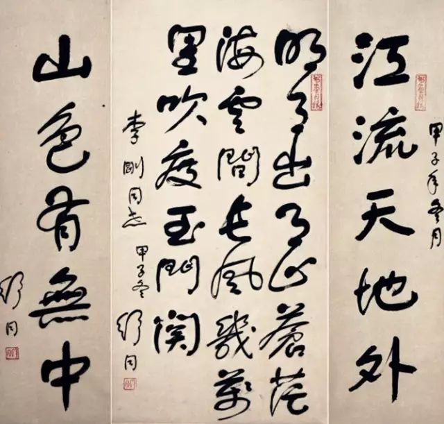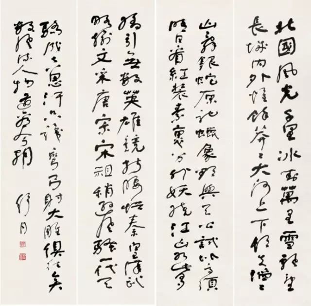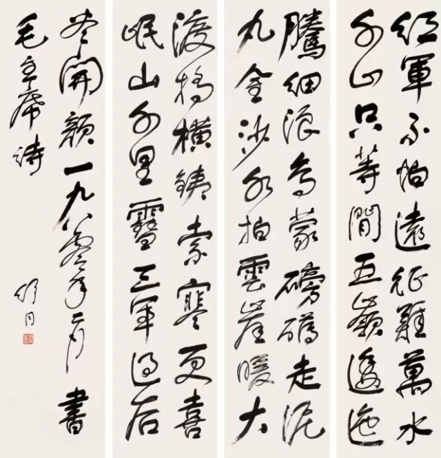 1959年的一天,舒同陪毛泽东去看郊外一座古寺,那里有一些古人墨迹,两人又侃谈起来。舒同问:“主席,您的书法墨宝,中国人到处都可看见。您把草书艺术推到了一个划时代的高峰,堪称中国近代狂草第一人。”毛泽东沉思后回忆道:“我练字历经了四个阶段。第一阶段是1921年以前,打下书法基础;第二阶段是建党后到抗战爆发,由于流动性和严酷斗争环境,留下的作品不多;第三个阶段是1938年到1949年,我用文房四宝打败了国民党四大家族;第四个阶段是进北京城后,全国人民兴高采烈,我的书法也就欢快飞动了。”