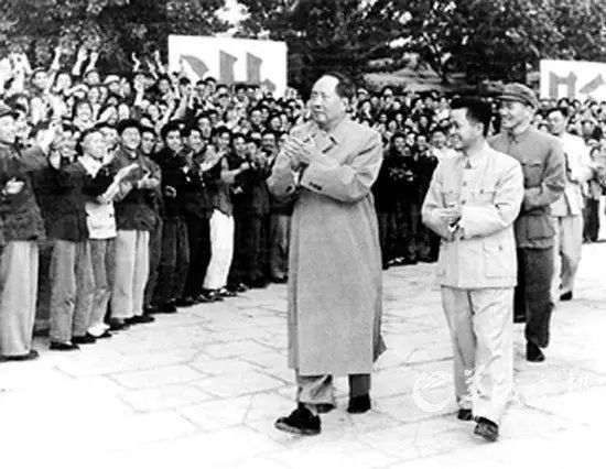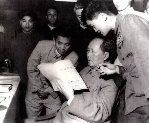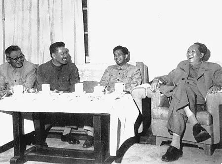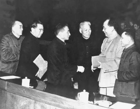 毛泽东主席与舒同等亲切交谈(左三为舒同,左二为白如冰,左一为刘季平)。