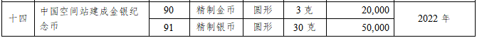 根据中国人民银行的发行计划,今年计划发行一组“中国空间站建成金银纪念币”,包含1枚3g金币和1枚30g银币。