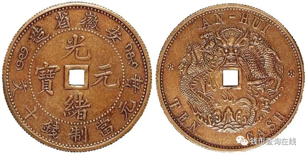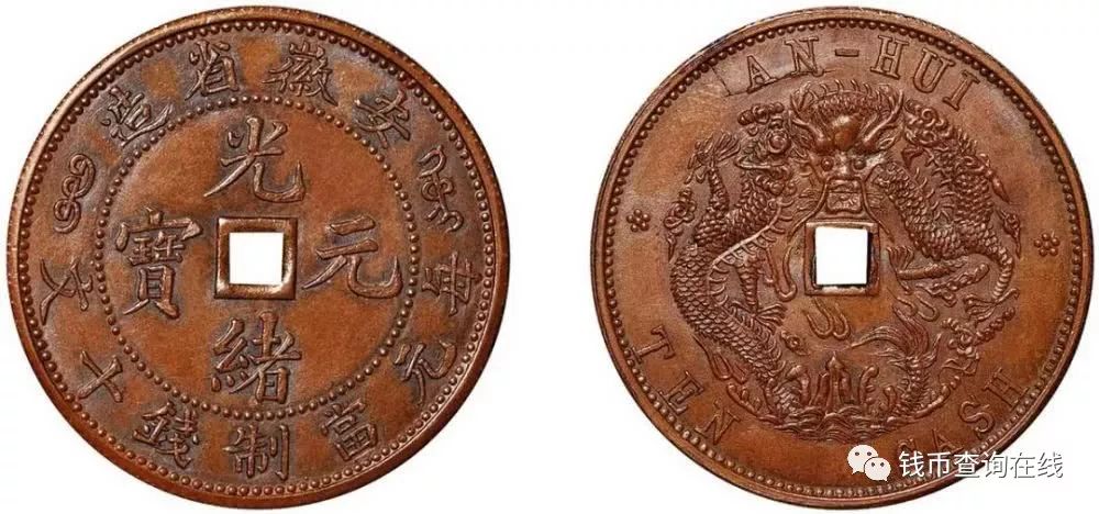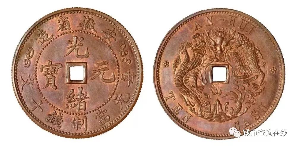 “光绪二十六年,广东省试造铜元,流通顺利,获利甚丰,各省竞相效仿,安徽当局遂由聂缉规奏准设立铜元局。光绪二十八年五月,在安庆设立安徽铜元局,开始试铸五文、十文铜元,安徽方孔十文,可能在当时试铸,因费工费时,且模具极易损坏,所以没有大量制造,存世量不超过二十枚。...安徽方孔十文制作精美,文字、币面设计十分巧妙,中间穿孔兼具传统与现代,为我国铸币史上一朵奇葩,虽然没有名列前茅,但是却是收藏家梦寐以求而不能得之稀罕珍品”-摘自台湾郑仁杰著《中国铜元鉴赏》第15页。