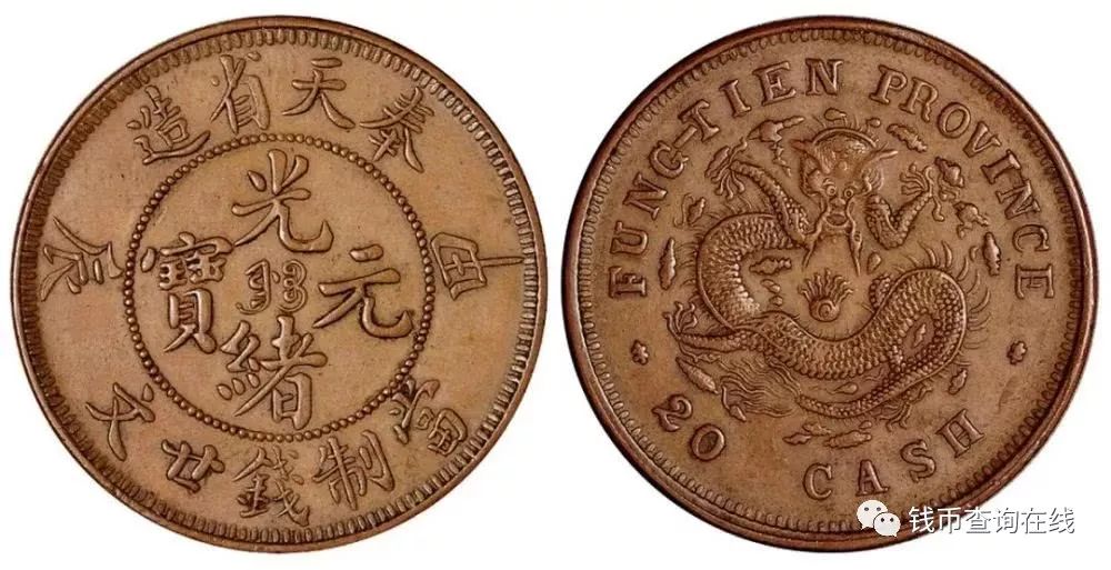 ⊙简介:1904年甲辰奉天省造光绪元宝二十文铜币一枚,红铜质,为试铸样币,目前所知存世仅二枚,中国铜元珍罕品种。