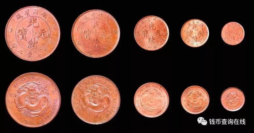 ⊙简介:1894年湖北省造光绪元宝库平七钱二分、三钱六分、一钱四分四厘、七分二厘、三分六厘银币红铜样币全套五枚,均完美品相,全套甚为难得,近未使用至完全未使用品。