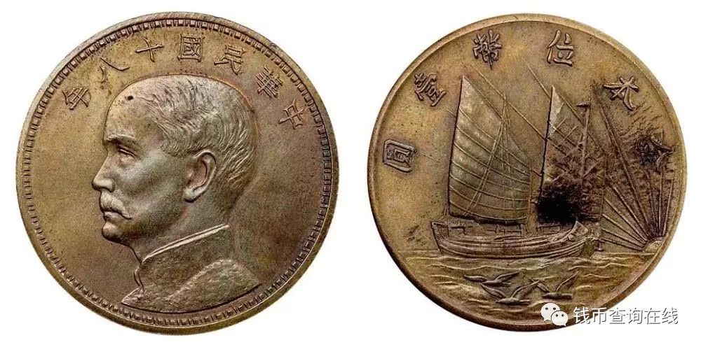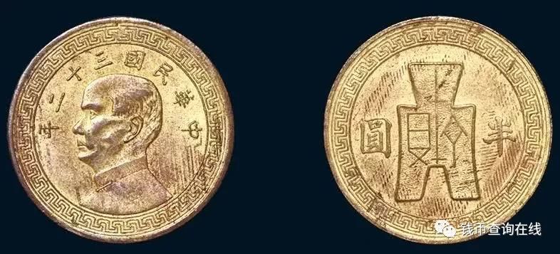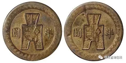 ⊙简介:民国时期双面布图半圆黄铜样币一枚,合面,极为少见,近未使用品。