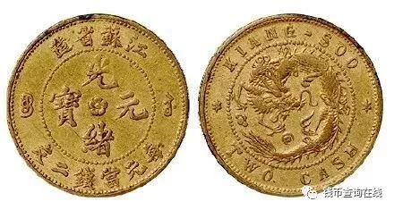 ⊙简介:1902年江苏省造光绪元宝二文飞龙黄铜样币, 存世少见, 秋友晃旧藏, 极美品。