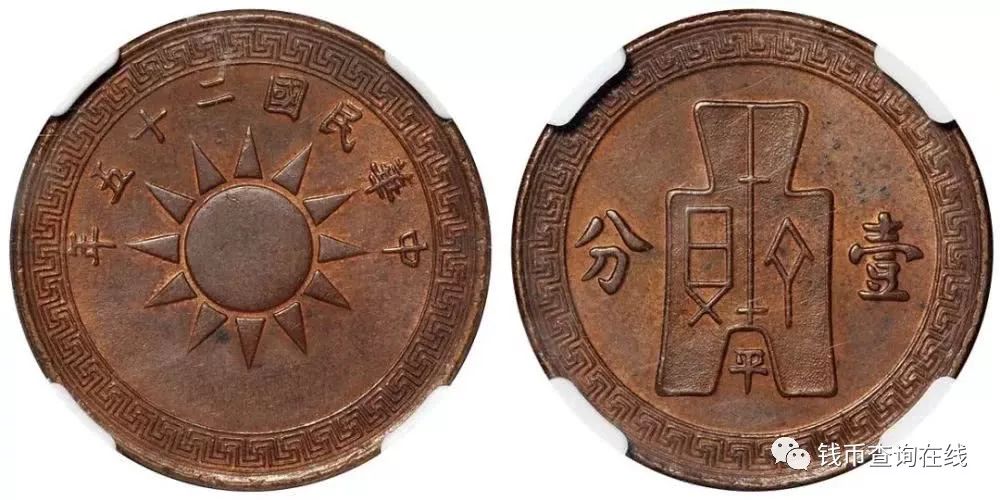 ⊙简介:民国二十五年党徽布图“平”字壹分红铜样币一枚,存世极稀,保存完美,珍罕,NGC MS63BN