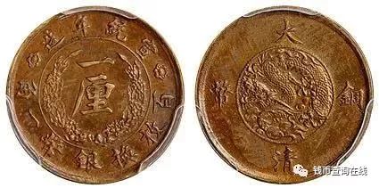 ⊙简介:1905年广西省造光绪元宝飞龙十文铜币样币,“龙尾中有点”版,45°逆背,PCGS SP62BN金盾,为德国代制之样币,未正式发行,目前已知存世仅十余枚,状态极佳,中国铜元之顶级珍品。