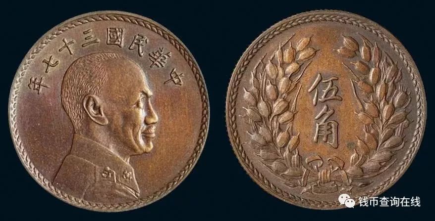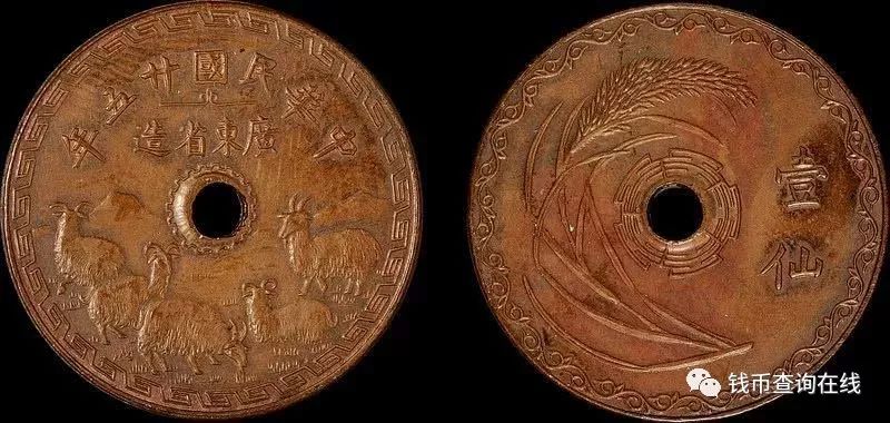 广东省会广州市旧称五羊城,故此枚铜币正面以五只大尾绵羊作为主图案,俗称“五羊仙”。此币铸成之时,恰逢国民政府推行法币政策,大量发行党徽图铜、镍辅币,故未能正式行用。“五羊仙”铜币设计独特,铸造精美,具有籍钱币图案凸显地域特色的先进意识,加之铸造量稀少,一直以来都是收藏者热衷追求的目标,是中国近代铜元中不可多得的珍贵品种。
