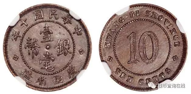 ⊙简介:民国十年广西省造壹毫银币铜样币,NGC MS63BN。