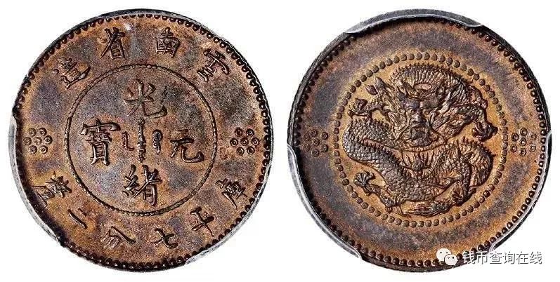 ⊙简介:1911年云南省造光绪元宝库平七分二厘银币铜质样币,齿边,龙面火珠下二小圈,据悉系后期加铸减色之版别区分记号,铜质样币极为少见,PCGS SP62BN,目前获该公司评级入盒者仅此一枚。来源:中国近代著名收藏家族—NC旧藏。