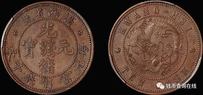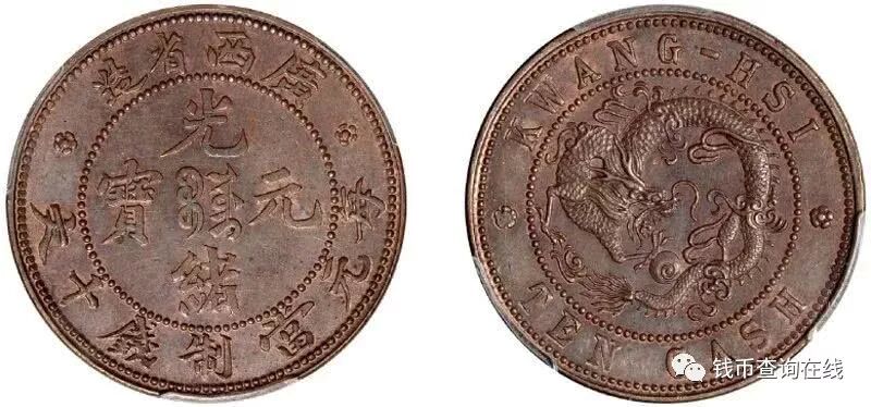 广西光绪十文铜元,红铜质。正面中央铸满文“宝桂”,外环铸“光绪元宝”及珠圈,上缘铸“广西省造”,下缘铸“每元当制钱十文”,左右两侧各铸一“梅花星”;背面中间为龙图,俗称“飞龙”,外环珠圈,上缘铸英文纪地“广西”,下缘铸英文纪值“十文”,左右两侧各铸造一“梅花星”。