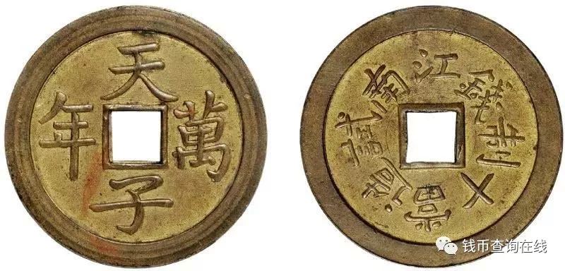 光绪二十二年,两江总督刘坤一,委派藩台江司瑞为总办,又派营务处桂崇庆勘地建造厂房,在省城(南京)西水关内云台闸南岸,沿河购地四十四亩为建厂基地,并分别向英德两国添购机器,次年落成,定名为“江南铸造银元制钱总局”,内分东、西两厂,东厂专造银元,西厂鼓铸制钱。西厂于光绪二十四年三月,试造一种内有方孔的铜元,正面以“江南试造当十制钱”均匀环绕币面,背面有“一统万年”和“天子万年”两种,未发行,数量极少。— 摘自郑仁杰著《中国铜元鉴赏》第58页。