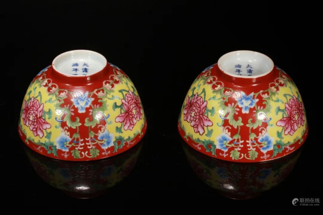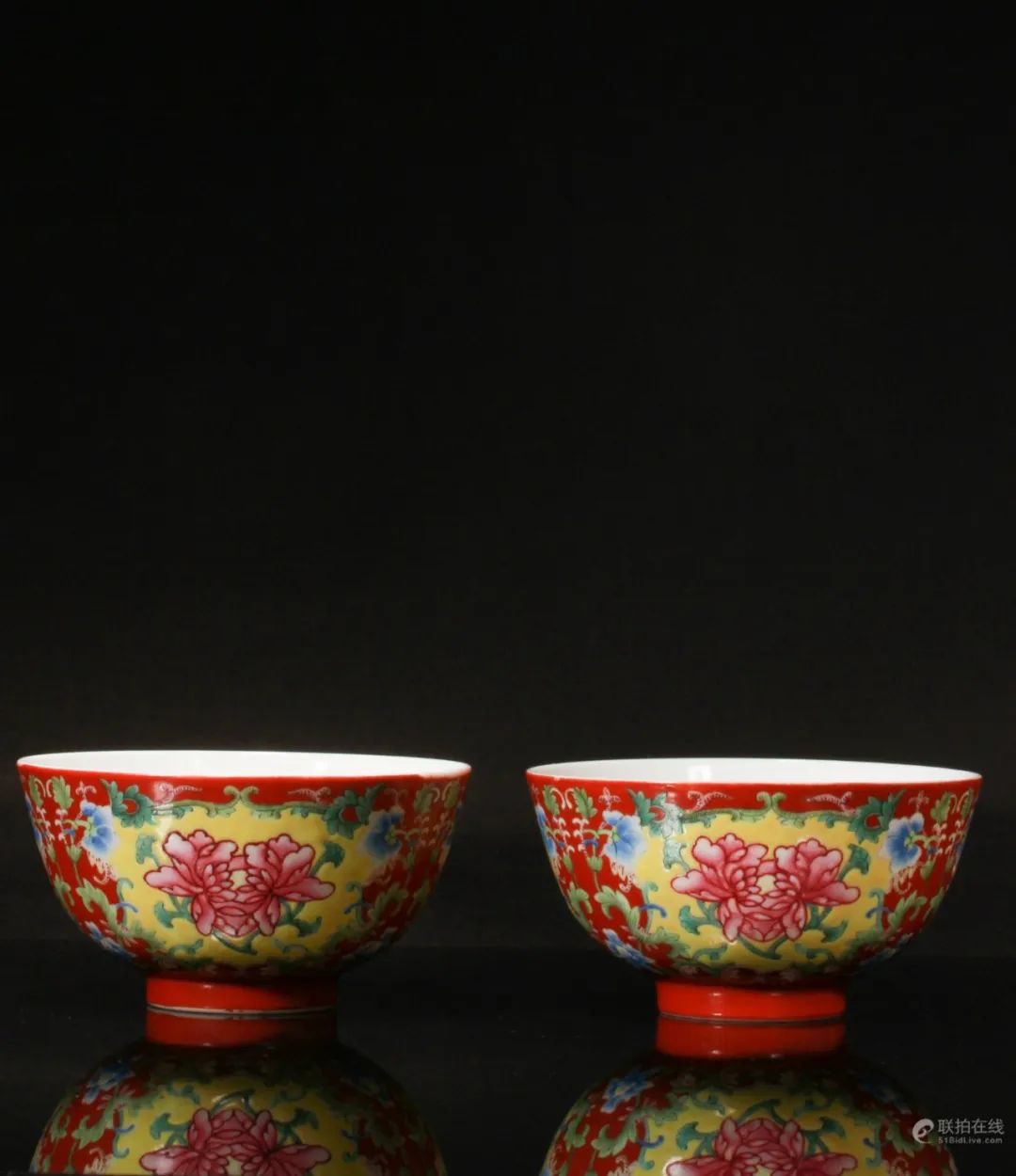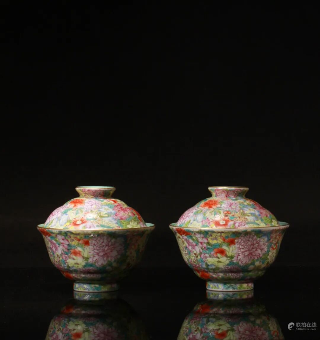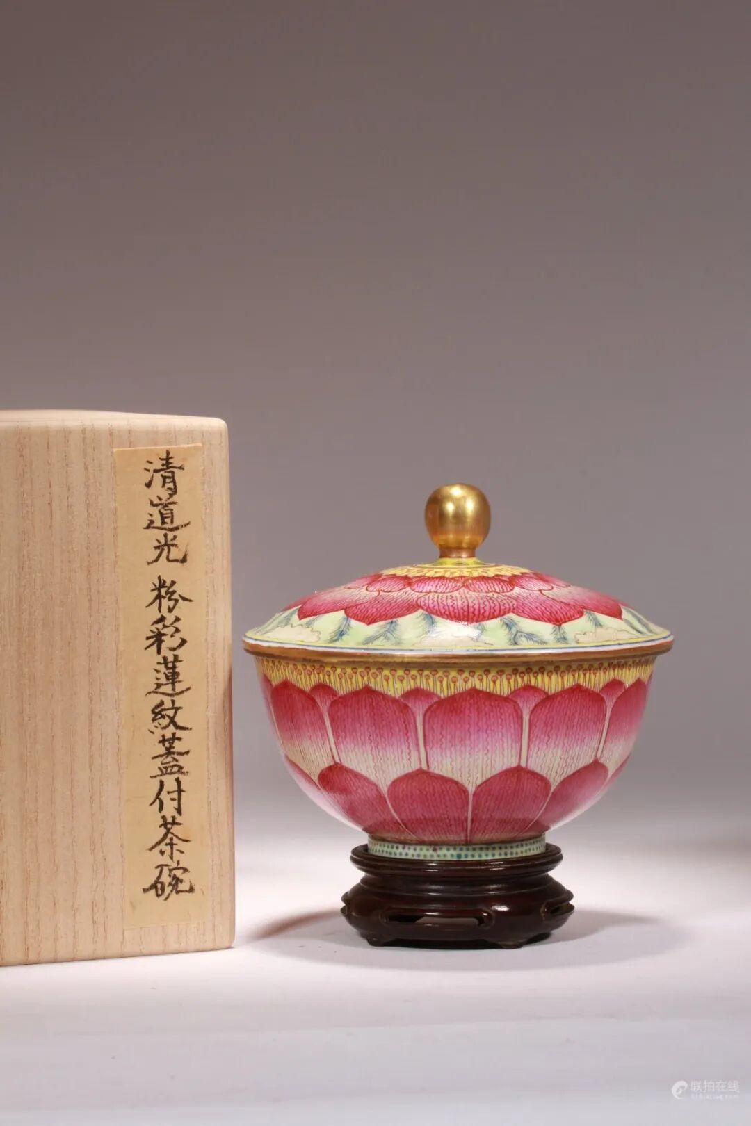 盖碗是一种上有盖、下有托,中有碗的茶具。盖为天、托为地、碗为人,暗含天地人和之意,又称“三才碗”、“三才杯”。本件盖碗以莲花为造型,口沿与圈足饰金彩,以仿铜胎。盖中心饰莲心,金彩宝珠形钮,周围饰以粉彩莲瓣,瓣下露荷叶。碗内施白釉,外壁口沿绘莲蕊纹,腹部绘三重莲瓣,粉彩仰莲相互映衬,圈足绘成莲柄式,以精细的纹饰描绘莲瓣筋脉,绘工精细。全器颜色娇艳,形制独特,尽显宫廷皇家之气派,其设计源于康熙铜胎画珐琅器物,为官窑精细之作。底有青花「大清道光年制」六字三行篆书款。Lot 2217 清光绪 胭脂红地粉彩开光折枝牡丹纹碗 一对明代晚期以后,随着西洋传教士在宫廷供职,西洋艺术也进入了中国,出现了一些融合中西艺术特征的瓷器。本碗敞口,弧腹,圈足,纹饰源自康熙朝珐琅彩器物,碗外壁施珊瑚红彩为地,其上以西洋巴洛克风格的缠枝花卉围绕成三组开光,内绘黄地折枝牡丹纹图案,施彩浓厚艳丽,红黄二色对比强烈,衬托牡丹娇艳异常,更加突出了画面的立体效果,具有鲜明浓郁的宫廷华丽色彩。底施白釉,足内以青花书「大清光绪年制」双行楷书款。Lot 2218 清乾隆 粉彩百花不落地盖碗 一对