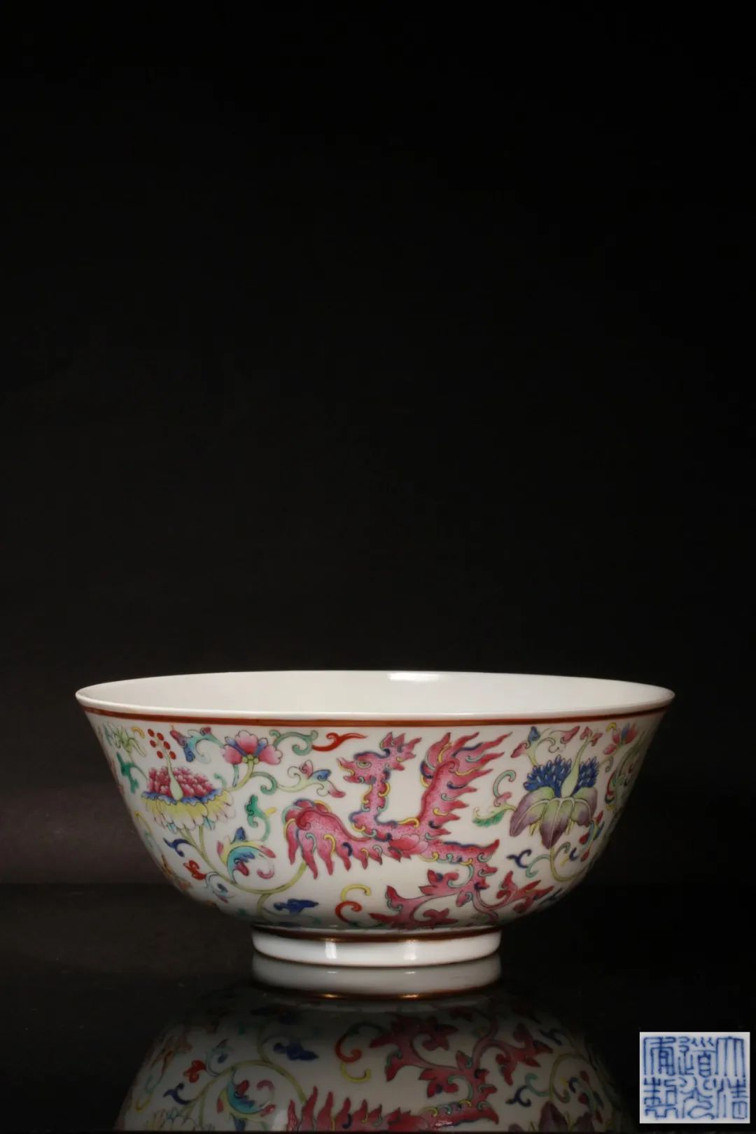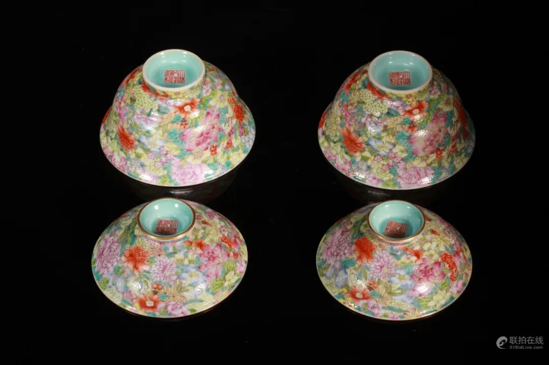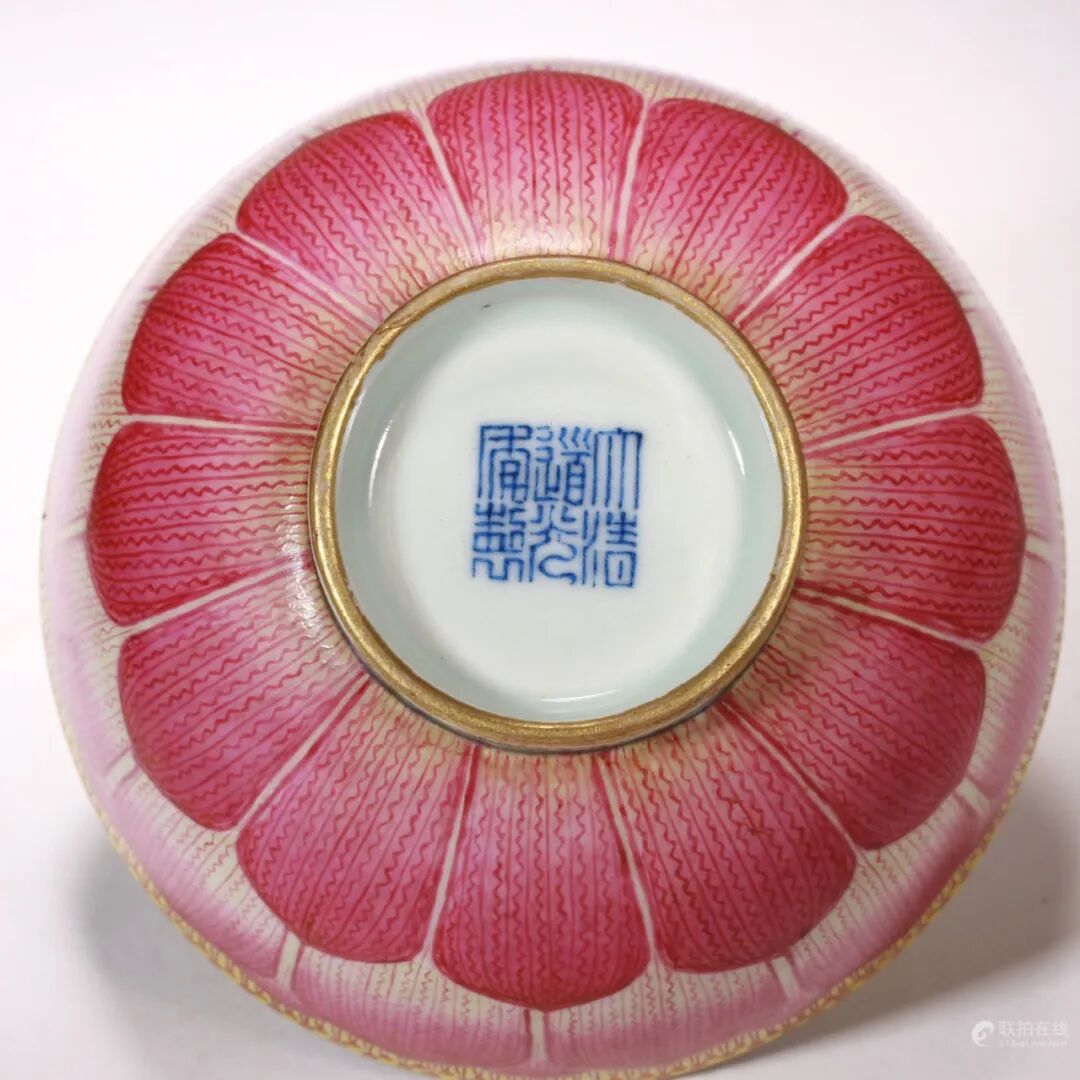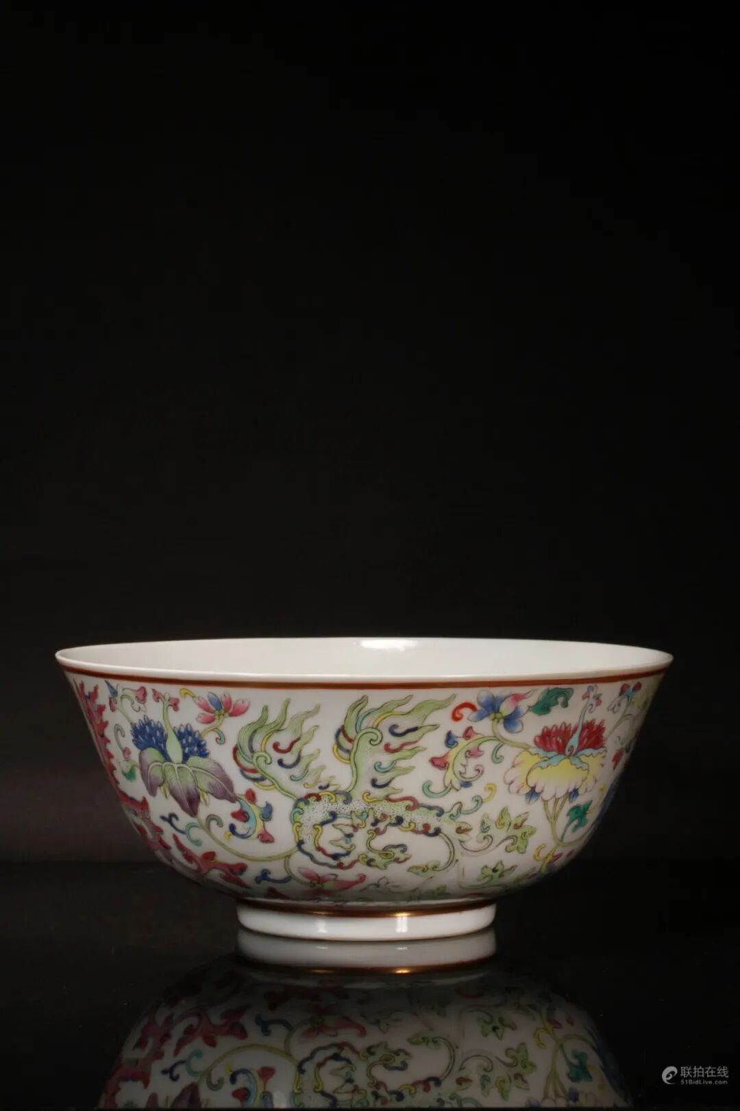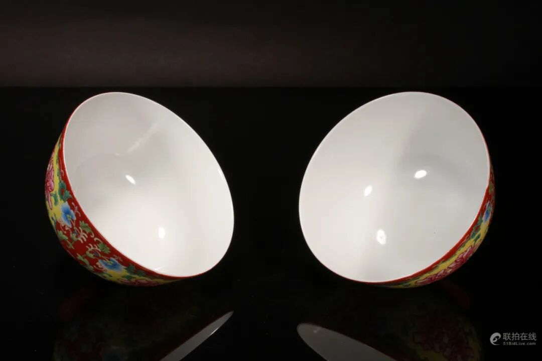 盖碗是一种上有盖、下有托,中有碗的茶具。盖为天、托为地、碗为人,暗含天地人和之意,又称“三才碗”、“三才杯”。本件盖碗以莲花为造型,口沿与圈足饰金彩,以仿铜胎。盖中心饰莲心,金彩宝珠形钮,周围饰以粉彩莲瓣,瓣下露荷叶。碗内施白釉,外壁口沿绘莲蕊纹,腹部绘三重莲瓣,粉彩仰莲相互映衬,圈足绘成莲柄式,以精细的纹饰描绘莲瓣筋脉,绘工精细。全器颜色娇艳,形制独特,尽显宫廷皇家之气派,其设计源于康熙铜胎画珐琅器物,为官窑精细之作。底有青花「大清道光年制」六字三行篆书款。Lot 2217 清光绪 胭脂红地粉彩开光折枝牡丹纹碗 一对明代晚期以后,随着西洋传教士在宫廷供职,西洋艺术也进入了中国,出现了一些融合中西艺术特征的瓷器。本碗敞口,弧腹,圈足,纹饰源自康熙朝珐琅彩器物,碗外壁施珊瑚红彩为地,其上以西洋巴洛克风格的缠枝花卉围绕成三组开光,内绘黄地折枝牡丹纹图案,施彩浓厚艳丽,红黄二色对比强烈,衬托牡丹娇艳异常,更加突出了画面的立体效果,具有鲜明浓郁的宫廷华丽色彩。底施白釉,足内以青花书「大清光绪年制」双行楷书款。Lot 2218 清乾隆 粉彩百花不落地盖碗 一对