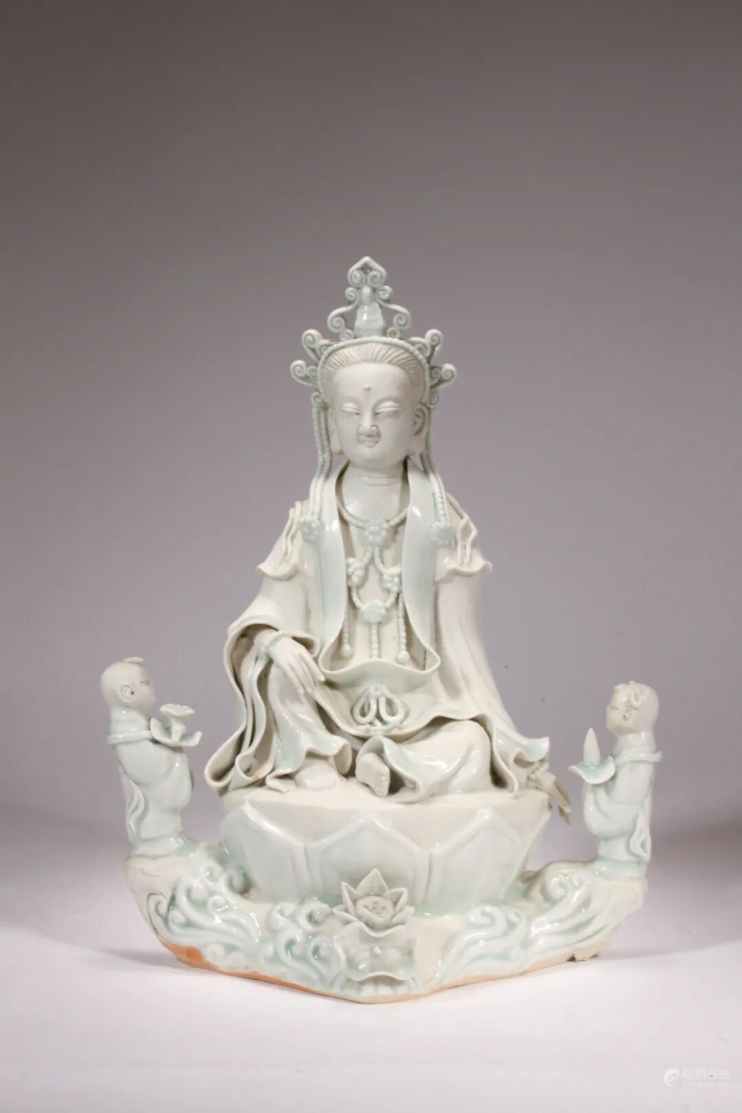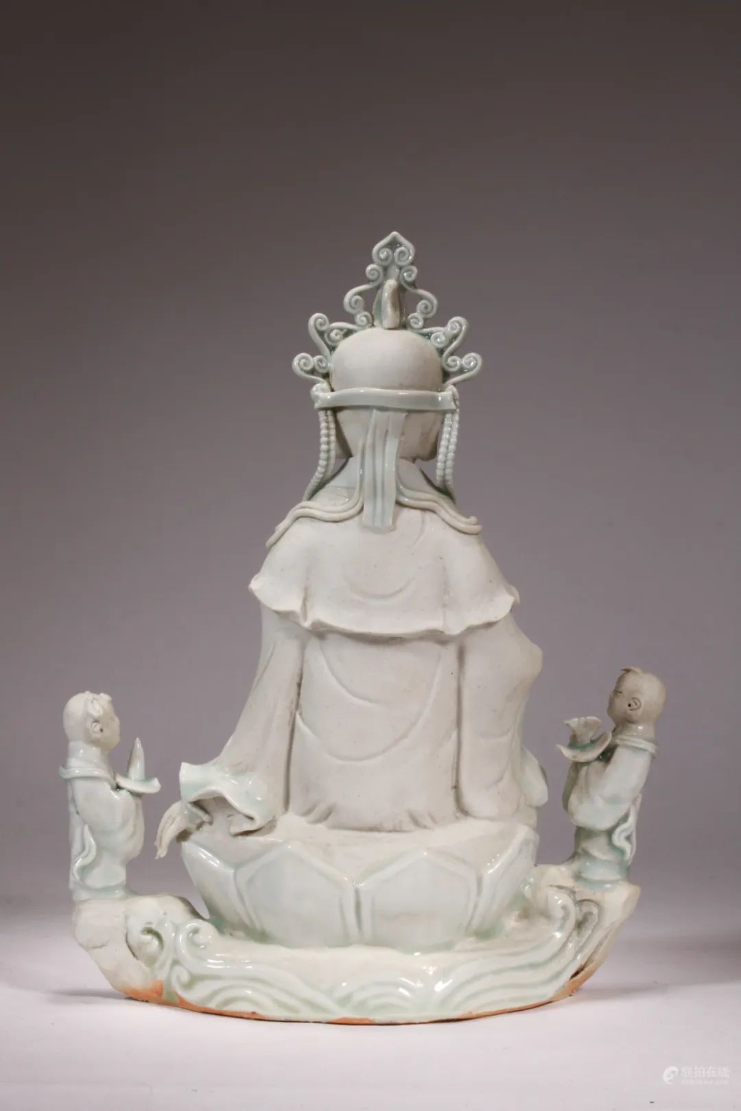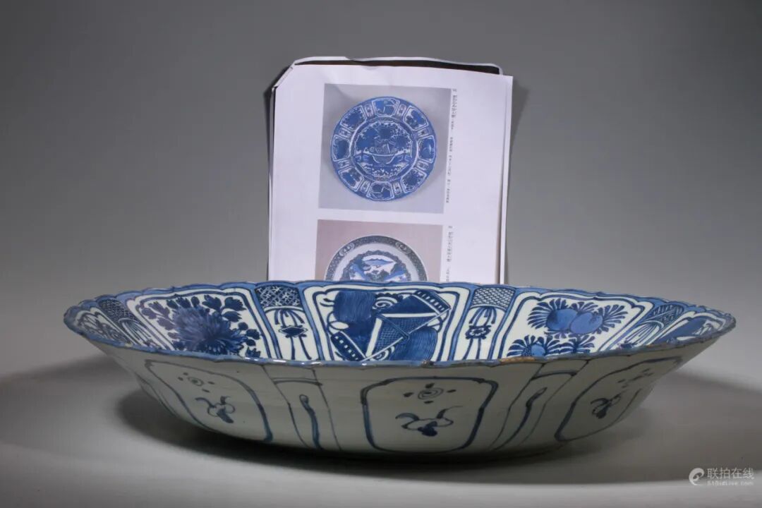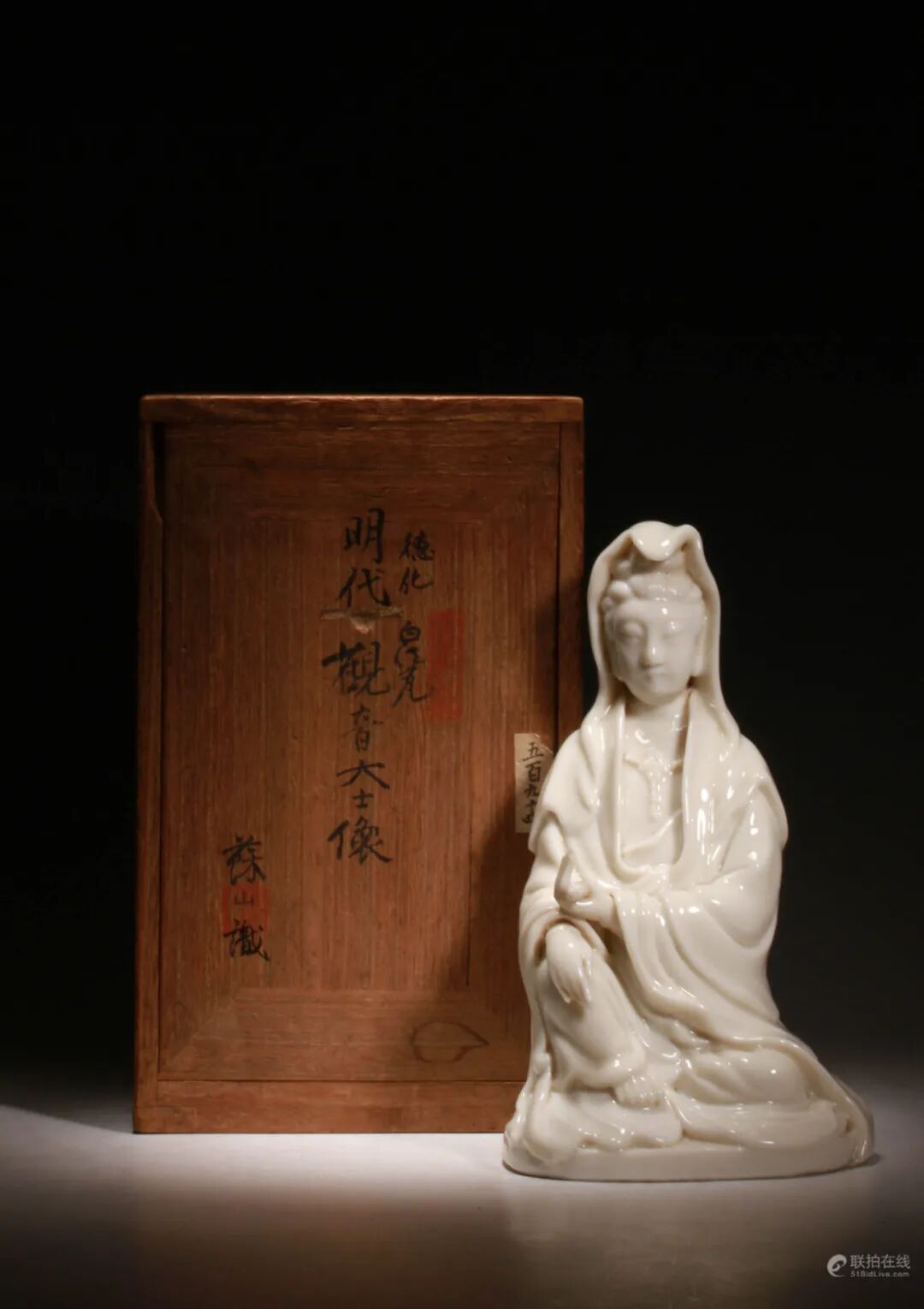 辰砂又称朱砂、丹砂,为粒状或块状集合体,主要成分为硫化汞,呈颗粒状或块片状,鲜红色或暗红色,具光泽。窑变釉是唐英督理景德镇御窑厂时仿钧窑釉色所繁衍出的一个创新品种,它将含有不同呈色元素的色釉融于一体,在窑炉中高温烧制,釉料相互交融,自然流淌,在熔融过程中,呈现色彩斑澜的釉色。此瓶瓶身修长,撇口,束颈,斜直腹,四方足,器形规整,釉面光亮滋润,紫红与蓝白色相互交融,如瀑飞流直下。配木座,适宜陈设观赏。明代晚期大量生产一种既有东方民族传统风格、又充满着浓郁异国情趣的青花瓷盘,这种瓷盘的内壁有六到八个开光,开光内绘各种不同题材的纹饰,是当时外销瓷中的重要品种之一,日本人称之为“芙蓉手”。本盘撇口,浅壁,塌底,圈足。通体以青花装饰。盘心绘博古纹,内壁绘锦地开光八组,开光内绘花果八宝纹,外壁开光内绘花草纹,圈足内露胎无款识。德化窑以白瓷雕塑神佛像著称,尤以观音像最受人喜爱欢迎。此件观音眉目细长,法相端庄,发髻高束,头戴风帽,身着广袖通肩长衣,胸襟半袒,佩戴璎珞珠串,单膝屈起,右手置于膝盖之上,左手托如意右手之上于,人物造型生动,衣纹圆润飘逸,通体通体施白釉,中空,胎质洁白致密,釉色清亮泽润,晶莹如玉,令人赏心悦目。起拍价格:100,000 日元
