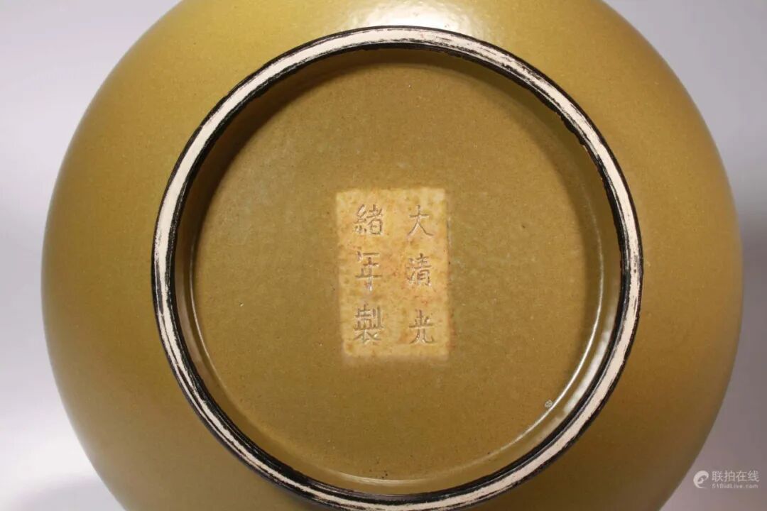 此件器型端庄隽雅,直口,长颈,溜肩,扁圆腹,圈足,器身光素不事雕饰,通体施鳝鱼黄釉,釉色静穆深沉,富有天然韵致。圈足端面刷铁褐釉,底部阴刻「大清光绪年制」六字双行楷书款。