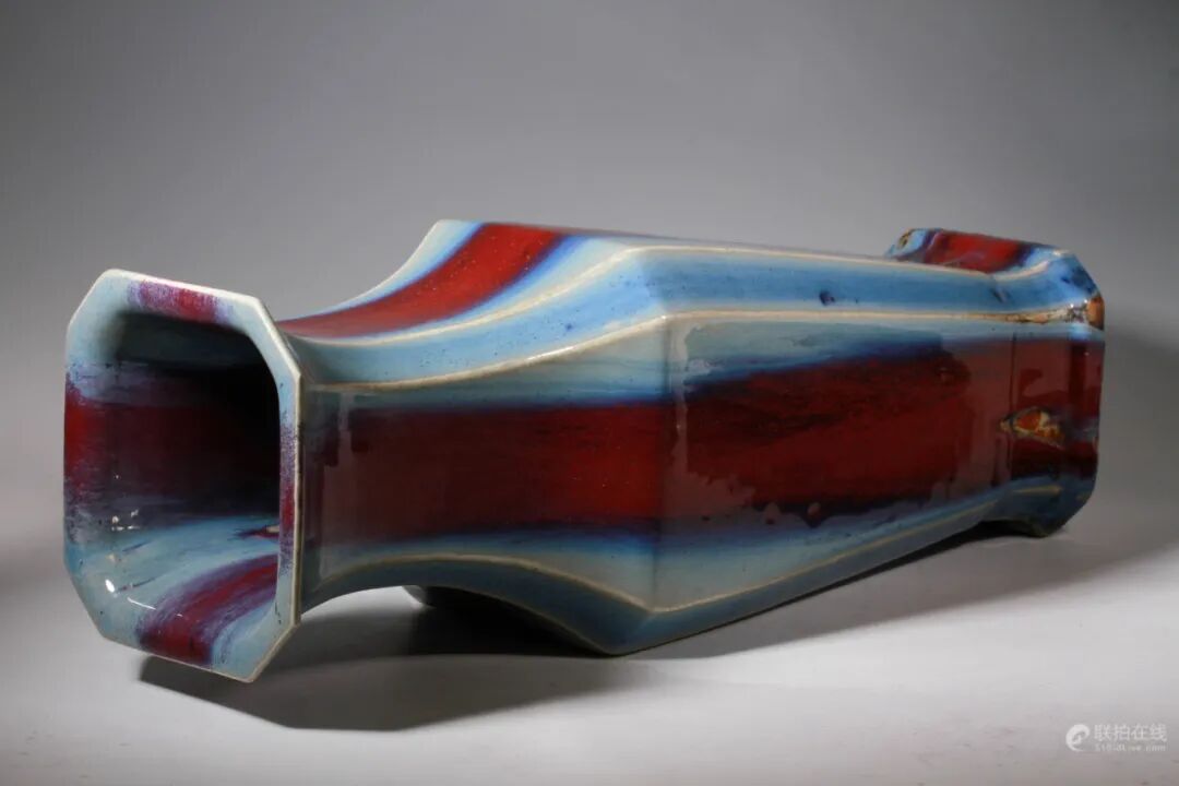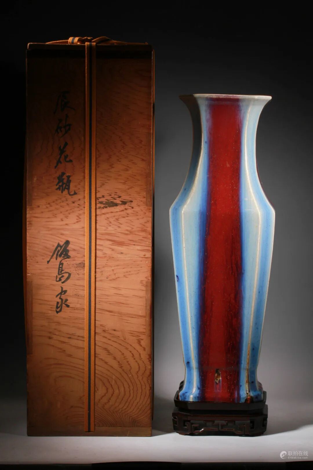 Lot 2167 清乾隆 辰砂窑变釉四方花瓶 付红木座