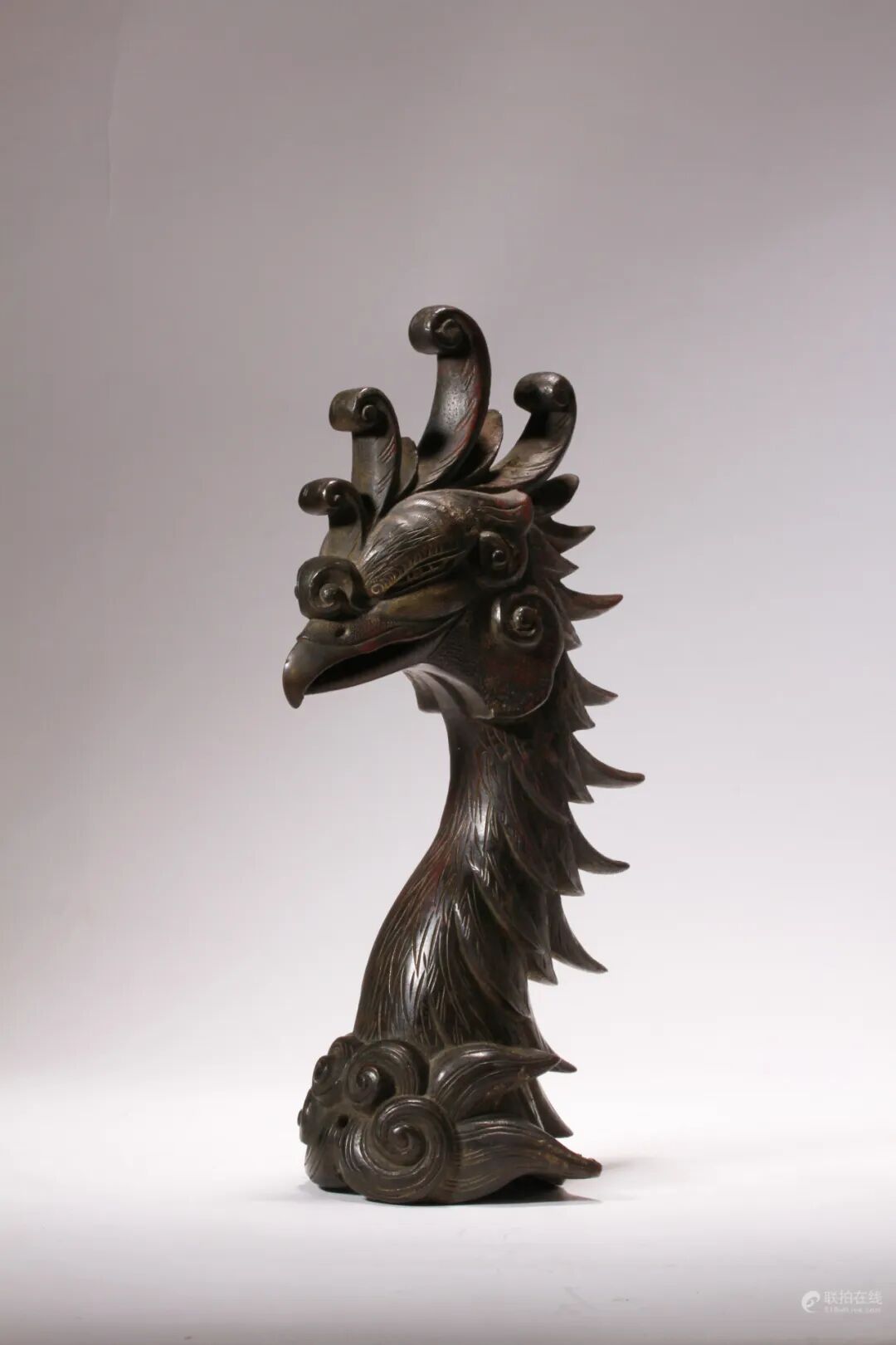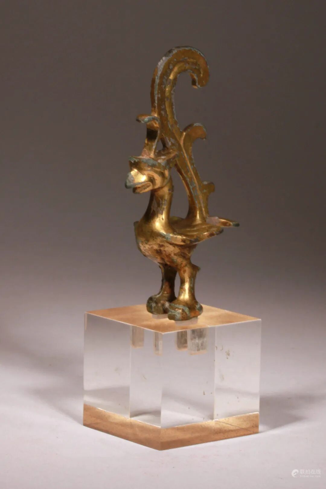 本件拍品为铜质鎏金,夔凤造型,立于水晶台上。凤凰振翅欲飞,尾翎飞扬,造型简洁朴拙而神气十足,应为仪仗陈设器物所用。
