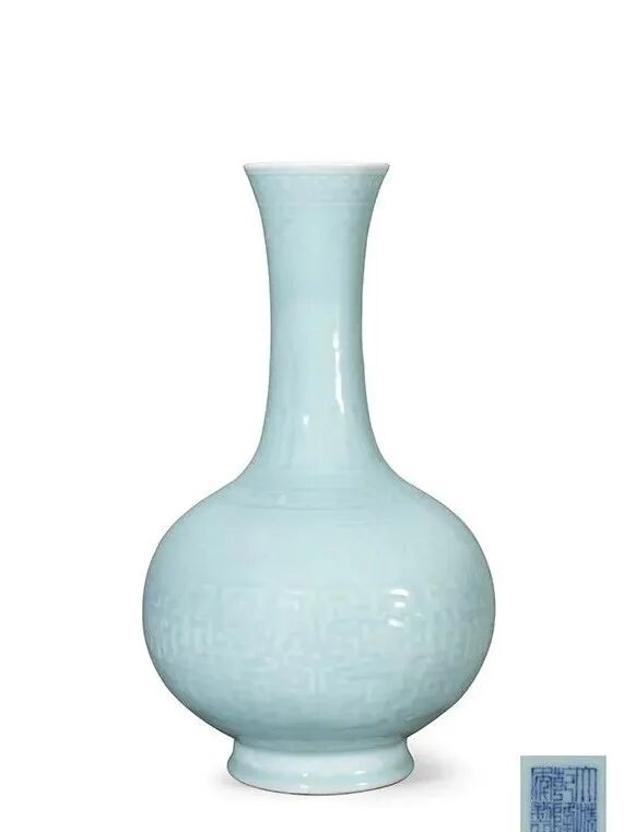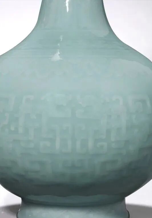 清乾隆 冬青釉浅浮雕夔龙撇口长颈瓶
