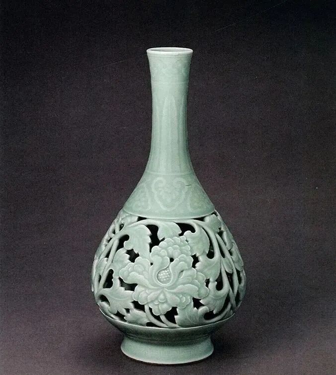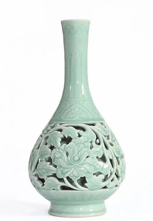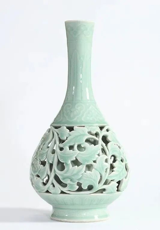 清乾隆 粉青釉镂空雕牡丹蕉叶如意纹长颈套瓶