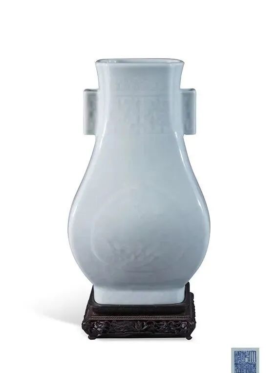 清乾隆 粉青釉浅浮雕暗刻夔龙瑞芝图双管杏元瓶