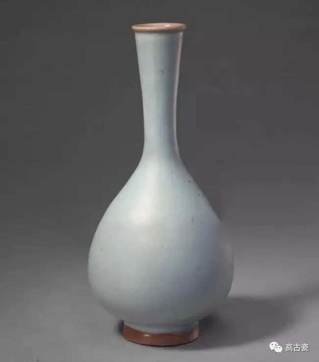 故宫博物院藏有一只钧窑长颈瓶,造型流行于宋金时期。这类俗称胆式瓶的造型有玉壶春瓶之俗韵,无玉壶春瓶之内涵。但此瓶之美色匀称如酥,让人的注意力从造型中移开,以釉色夺得关注是宋代钧窑创造迷人蓝色的初衷,我们今天可以感到,一千年前的宋人更能感受到。
