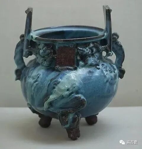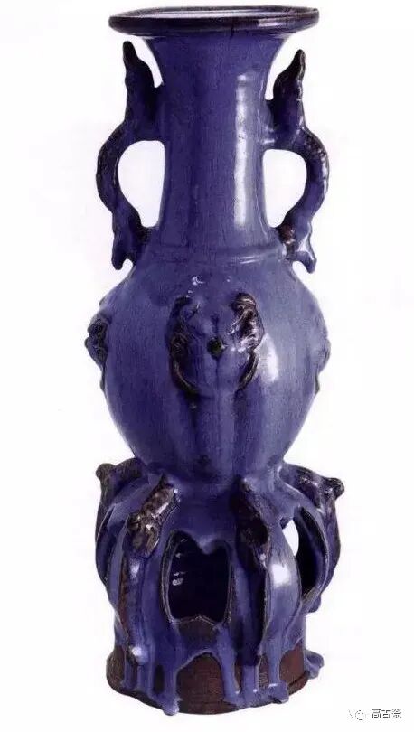 国家博物馆藏钧窑贴花螭耳连座瓶,为元代典型,流行一时;其釉色艳蓝,超出一般钧窑的表达能力,这件作品也是早年出土于内蒙古呼和浩特,可见蒙古人那时对它的热爱。