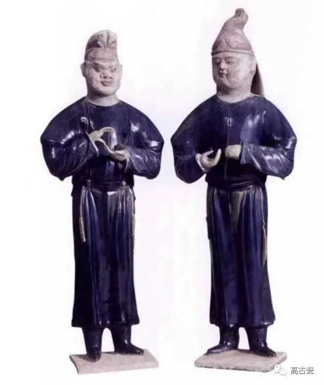 衣著蓝色衣衫的人俑历代出士罕见,只有唐三彩中偶有发现。日本出光美术馆藏有一对蓝釉文官俑,著圆领长衫,一个带幞头,一个带风帽:圆领长衫汉魏之前多出于西域,有别于中原地区的交领,六朝之后渐人中原,多用于官吏。此对蓝釉文官俑,面相似为一胡一汉,官职有别,气定神闲。尤其深蓝色的衣衫给人以镇静祥和之感;以圆领胡服东进扩张的速度,在唐早期仍不失为一种官方的时尚。
