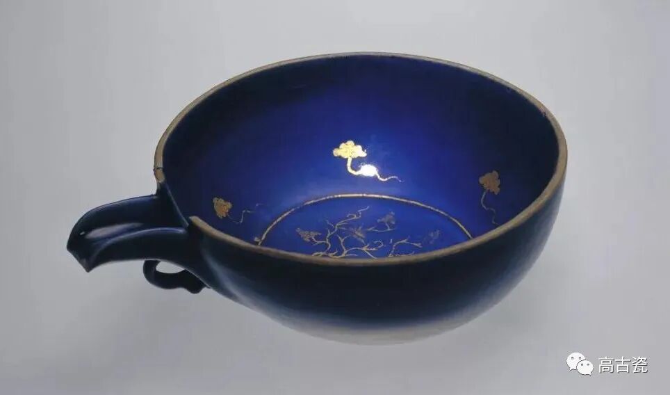 深沉凝重的蓝釉瓷器问世,对统治者蒙古人是个福音。元朝统治阶层中的回回人崇尚蓝色,缘于中世纪伊斯兰文化的习俗,中东地区随处可见的清真寺院,蓝色永远是基本色调。受伊斯兰艺术的影响,蒙古大汗开始对蓝色追逐,《元氏掖庭记》记载“元祖肇建内殿,制度精巧。…瓦滑琉璃,与天一色。”元朝的宫殿建设已在效仿伊斯兰风格,使用蓝色琉璃瓦,与蓝天同色。由此可见,元政府在景德镇所设的浮梁瓷局为蒙古大汗烧造蓝釉作品已是任务。1964年,河北保定出土一批元代窖藏瓷器,其中三件蓝釉描金作品,故宫博物院人藏一件匜,与前例宋金钧窑匜相比,流已变短。河北省博物馆入藏两件,一盏一盘,三件均描金,使得蓝釉作品变得华贵。