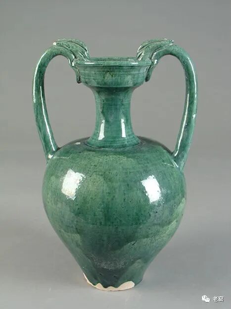 蓝釉双龙柄尊,唐代,高32厘米,盘口,长颈,鼓腹,平底。口、肩部饰以双龙柄,龙头、身、尾部无任何装饰,线条简洁流畅。通体施多层蓝釉,釉色匀净。现藏洛阳博物馆。1998年洛阳偃师唐恭陵哀皇后墓出土 。恭陵是武则天长子李弘的陵墓, “哀皇后”逝于唐上元三年(公元676年),葬于公元687年。