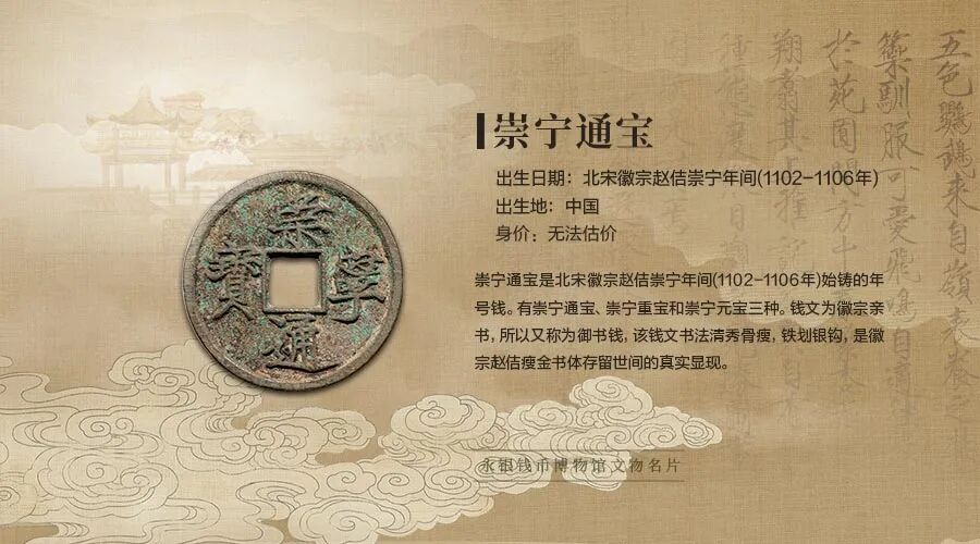 无论是寄情山水,沉迷丹青的端王,还是声色犬马、极尽奢靡的帝王,不过历史尘烟了无痕,剩得崇宁通宝上的斑驳寂寥,让人一叹千年。
