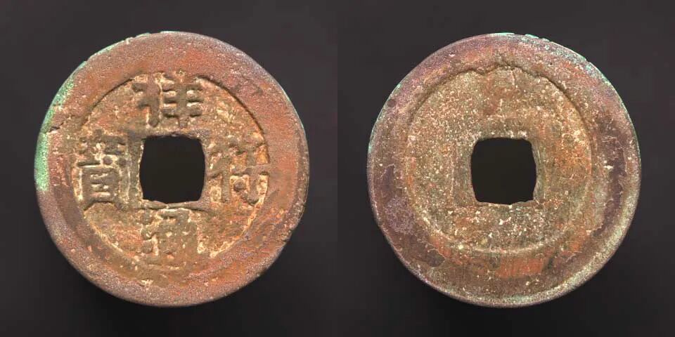 因为“大中”二字已被唐宣宗用过,于是宋真宗用“祥符”两字,铸造“祥符通宝”和“祥符元宝”两种年号钱,开创了钱文中元宝、通宝并用,一个年号同时铸造两种钱币的先例。