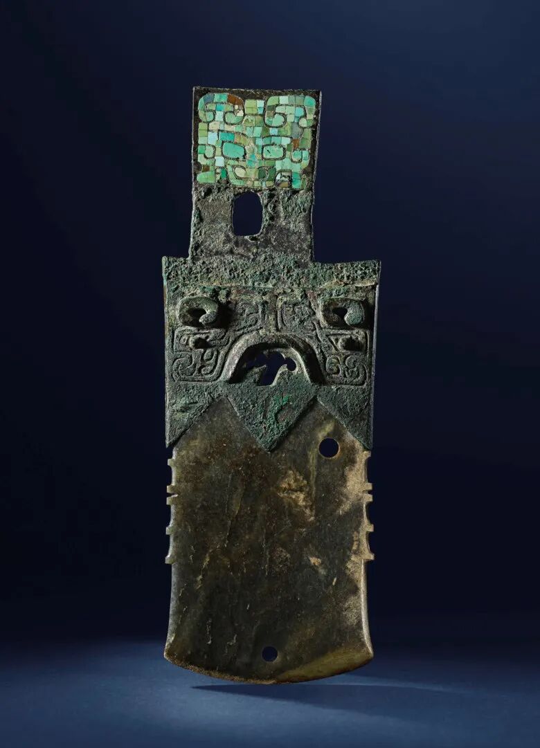 商 镶嵌绿松石兽面铜内玉戚。长 21 cm.。此拍品于2020年11月20日在佳士得香港售出,成交价6,250,000港元