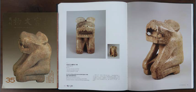 1930年代出土于河南殷墟西北岗1001号大墓的虎首人身跪姿立雕,载于1986年2月故宫文物月刊35期
