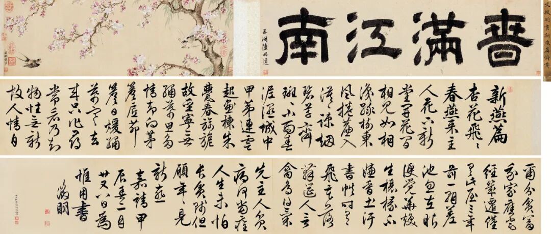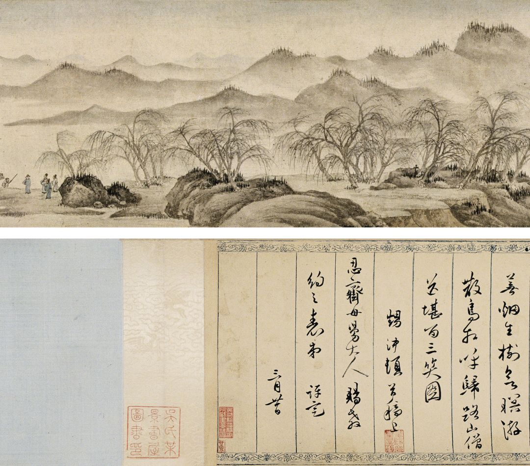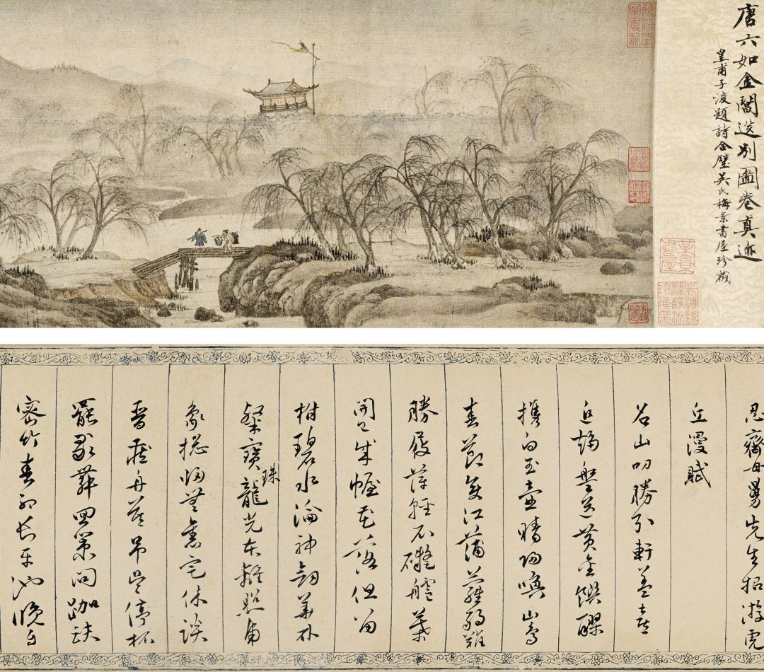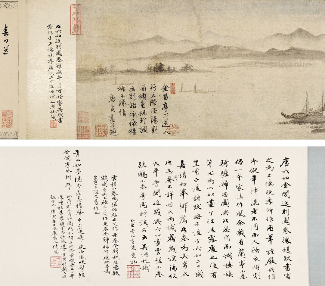 此卷为书画合璧,卷首即为吴湖帆题“唐六如金阊送别图卷真迹。黄甫子浚题诗合璧,吴氏梅景书屋珍藏。”此作亦曾为吴湖帆的藏品,并录入《吴氏书画记》中。画面绘江南景色,远山归帆,柳溪水岸,江边数人正相揖作离别之状。平远取景、以墨的浓淡与对景物刻画的虚实很好地构建了空间关系。同时,水墨与淡设色相得益彰,使画面呈现出清雅的格调。卷末有唐寅题画诗一首:“金昌亭下送人行,天际残阳对酒倾。重祝珍调无别语,依依杨柳不胜情。”落款为:“唐寅画并题”,钤“唐居士”、“吴趋”及“南京谢元”三枚朱文印。其后为皇甫子浚行书自书诗,诗前题写:“春日送忍斋母舅先生招游虎丘,漫赋。”综合文献可考皇甫子浚生于明弘治三年(1490),卒于嘉靖三十七年(1558),名冲,号少玄,明代诗人,长洲(今江苏苏州)人。嘉靖进士。官礼部主事、春坊司直兼翰林检讨,谪广平通判。旋移南京刑部主事、进员外郎,迁浙江按察佥事。好学工诗,负才名,与兄冲、弟汸、濂并称“皇甫四杰”。著《皇甫少玄集》。