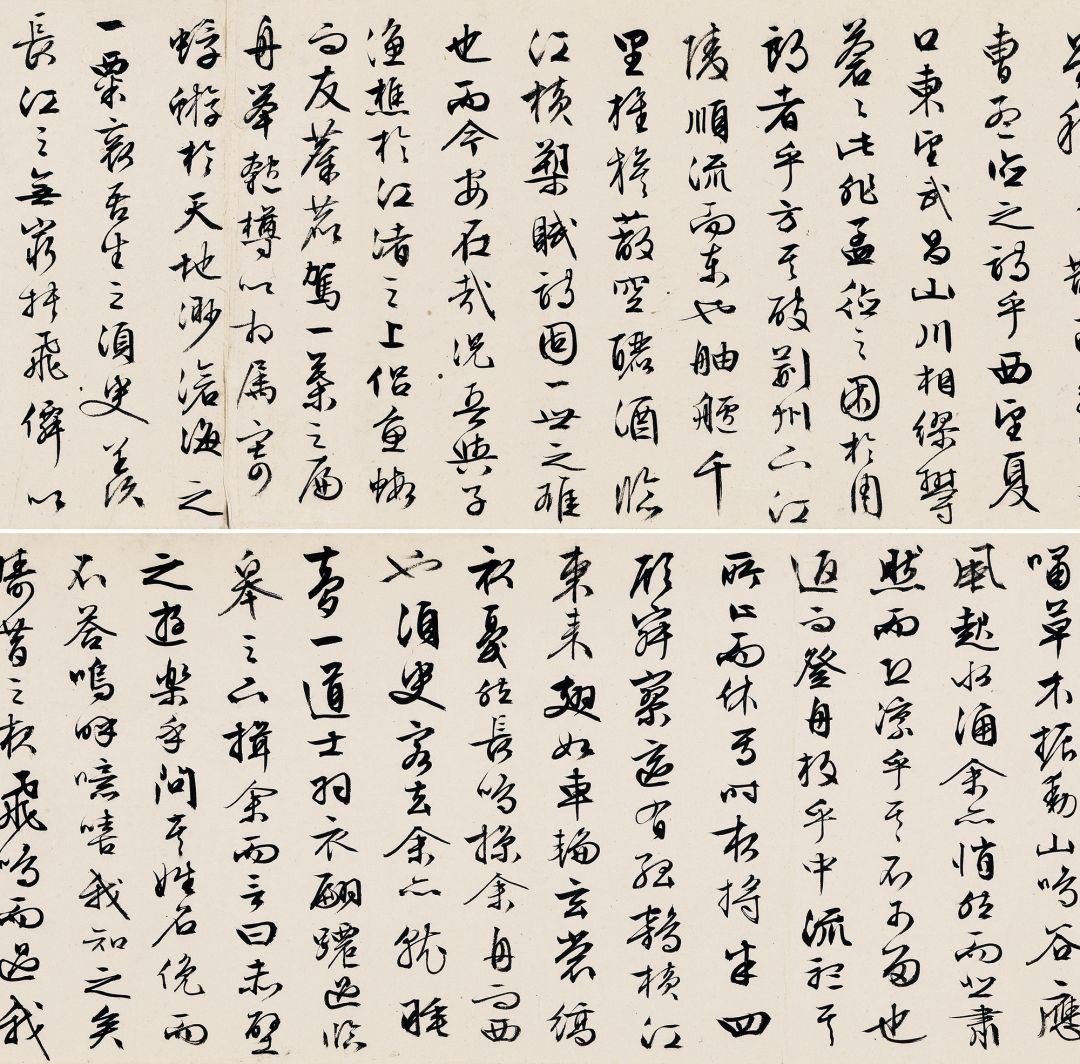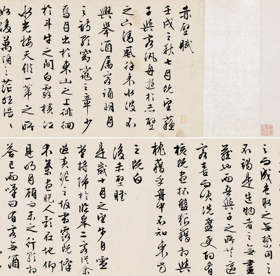 北宋元丰五年壬戌(1082),时被贬黄州的苏轼于“七月既望”和“十月之望”先后两次游览其附近的赤壁,写下千古名篇《赤壁赋》和《后赤壁赋》,统称《前后赤壁赋》。两篇文赋借景抒情,以表达其政治失意,无奈苦闷,而后忘怀个人得失之坦荡胸襟。苏东坡超凡脱俗之气度、对人生自我关照的胸怀为后世所仰慕传颂。从北宋时起,此文即为文人士大夫所争相拜领,如宋人乔仲常、杨士贤、高宗赵构、马远、马和之、赵伯驹、李嵩等人,金人武元直,元代有赵孟頫,明代吴门文徵明、仇英、文嘉、文伯仁、朱朗、钱谷等等或图或文,吟咏传颂,经久不衰。当然,这自然与中国封建文化的“达则兼济天下,穷则独善其身”的儒家思想息息相关,当不能为国尽忠,为民请命之时,“处江湖之远”而感叹“逝者如斯”,“物与我皆无尽也”,“惟江上之情风,与山间之明月,耳得之而为声,目遇之而成色”等等以佛、道思想进行超脱,亦是其自我救赎的一种生活方式。此文所传达的情感与文徵明后来的归隐出世是契合的,众所周知,文徵明一生科考无功,“凡十试有司,每试辄斥”,这令出身书香世家,时称“吴中四才子”的文徵明备受打击。五十四岁时,受工部尚书李充嗣的推荐、经过吏部考核,被授职低俸微的翰林院待诏的职位。翰林院同僚的嫉妒和排挤,文徵明五十七岁辞归出京,放舟南下,回苏州定居,仕途上的不如意恰与苏轼的被贬出京经历相似。文徵明书《赤壁赋》的创作年代都在文徵明六十岁之后,即为其短暂的赴京任职之后的作品。这种境遇与情绪也暗合了苏轼的经历,所以,这或许就是文徵明一生偏好《赤壁赋》的一个原因。