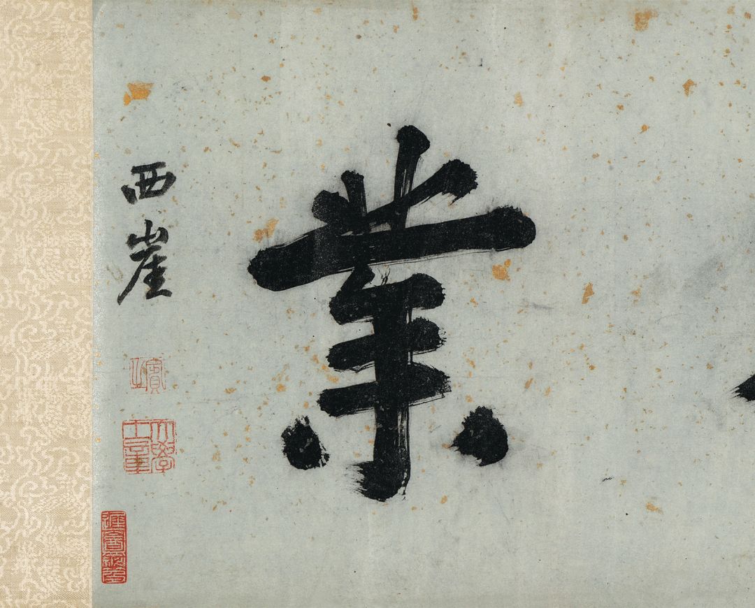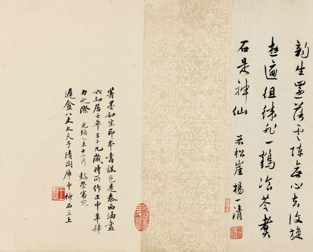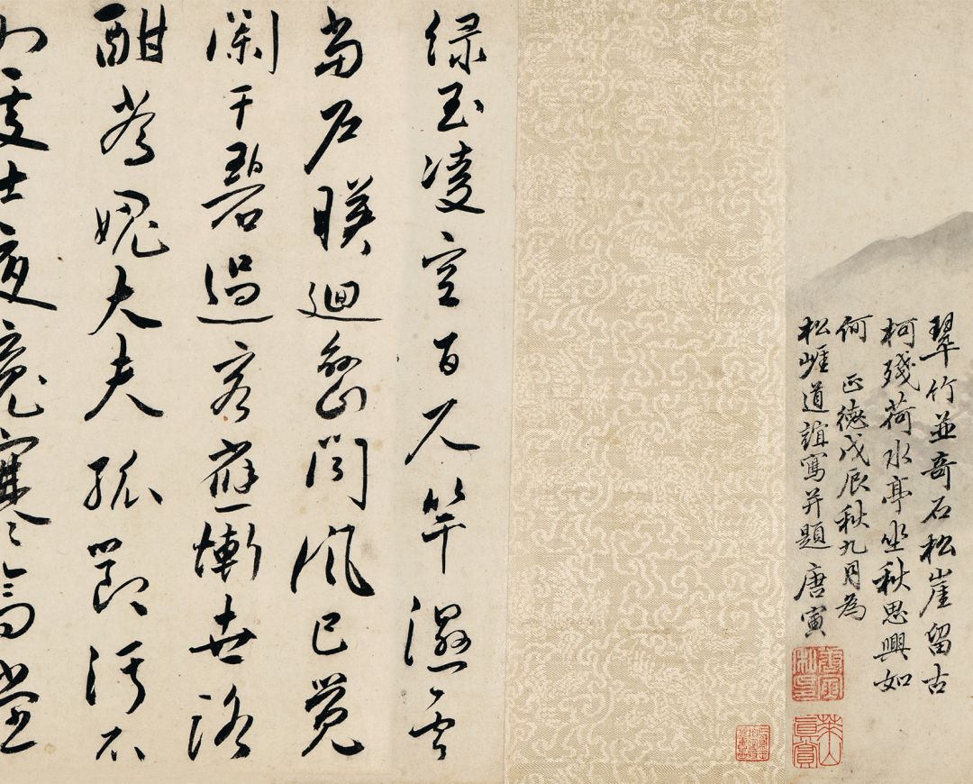 唐寅《松崖别业图卷》,仍保持清代宫廷原装原裱,唯玉别子已失,包首有佚名者题“唐寅画松崖别业”七字。李东阳以行楷书题引首“松崖别业”,落款“西崖”,下钤“宾之”、“大学士章”两枚朱文方印。画心纵32厘米,横124厘米,纸本着色,精洁如新,画幅右侧危崖突出,峭壁恰如斧劈,山石如积铁,着墨甚浓。崖石上壁横出一松,其势若盖,松崖下结瓦舍两楹前后排列,门扉敞阔,屋内可见两只石墩,亦可见有水图屏风一扇。屋后掩映数十竿修竹,院前右下巉石之后隐现石台,上陈樽罍水盂等数事,院前另有古柯两株,枝如篆籀,其旁修篁数枝,院中又有丹桂一株,正值九月花期,黄色花朵竞相开放。院内有二蓬头童子,一向茶灶执扇吹火,一奉茗碗徐行,另有一鹤低头觅食。画面中部水塘畔有方顶水亭一间,一高士便服长须,执羽扇倚栏观荷,亭中设书案及山水屏风各一,案上散放笔墨纸砚。画幅左侧远山满布,云树冥蒙,笔墨秀润,有一水从山中逶迤远来,流入水塘,近山之处远岸有矮屋出于树间,另有危楼耸峙。卷后唐寅自题“翠竹并奇石,松崖留古柯。残荷水亭坐,秋思兴如何?正德戊辰(1508年)秋九月,为松崖道谊写并题,唐寅。”下钤白文“唐寅私印”方章,卷前另钤朱文“六如居士”方章。