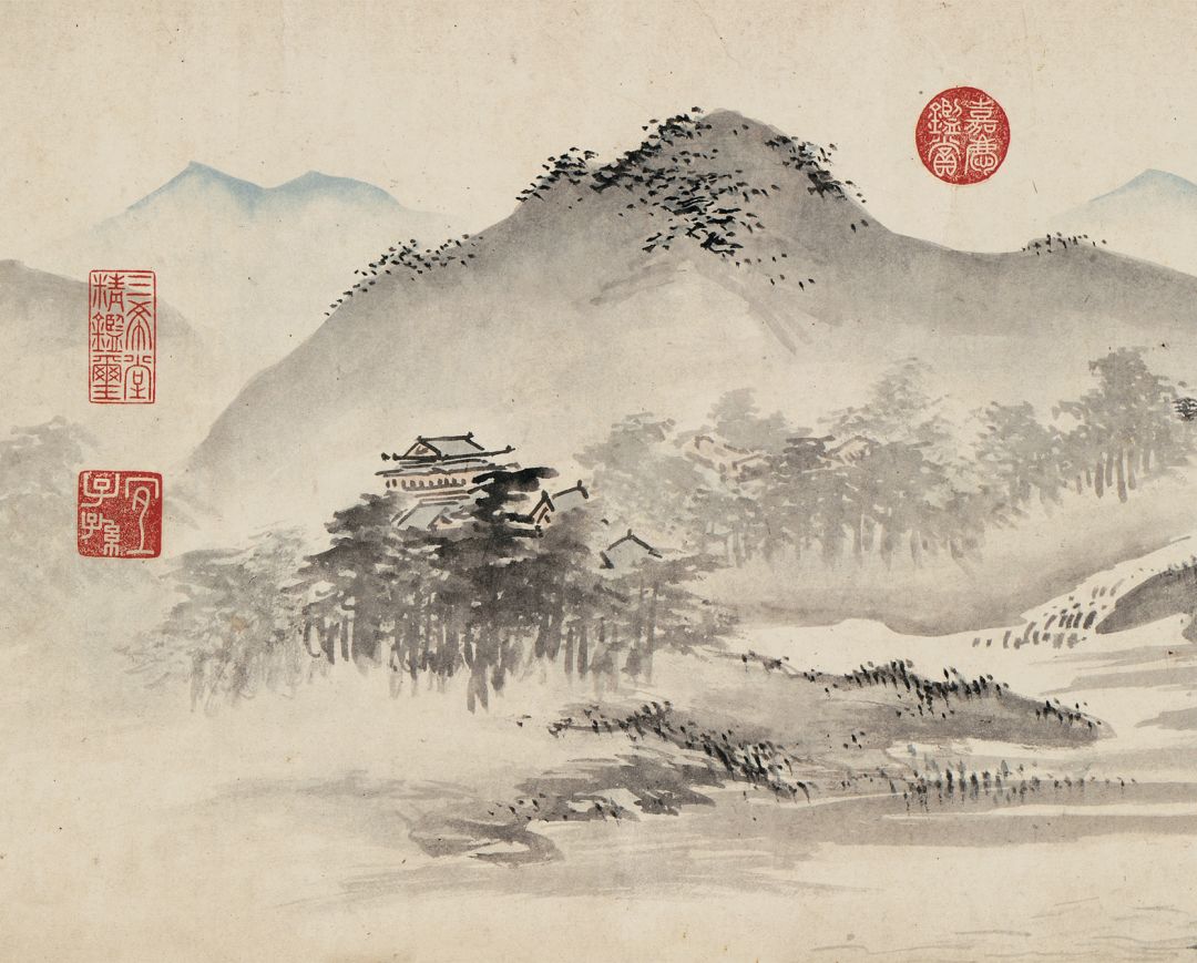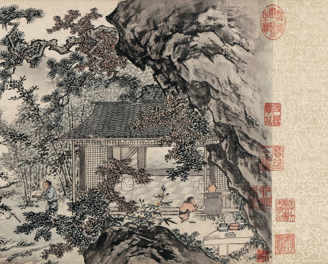 罗振玉旧藏文徵明《细笔山水》,所绘为隐逸高士听泉观瀑之图。远看两峰高耸,远山飘渺,山间有樵夫担荷而归;峰回路转,参天古木之下,隐逸高士盘坐于石床之上,仰视林泉,静听山间瀑布、溪流浅潭佩环之音,渐欲沉醉;旁有小童,恭敬谦敏,捧书而立,令人无限向往。此图为文徵明仿古细笔山水之作,山石勾勒多以干墨长线为主,流畅典雅,劲健爽然,又以王蒙牛毛、黄公望披麻以及倪云林折带皴法并用,淡墨干皴,苍茫老辣;古木以赵子昂、吴镇等为之,主干挺拔俊秀,穿插错落有致,枝叶勾描点厾整齐繁密,细致精工;勾水纹灵动神妙,微澜涌起,令观者怦然心动。