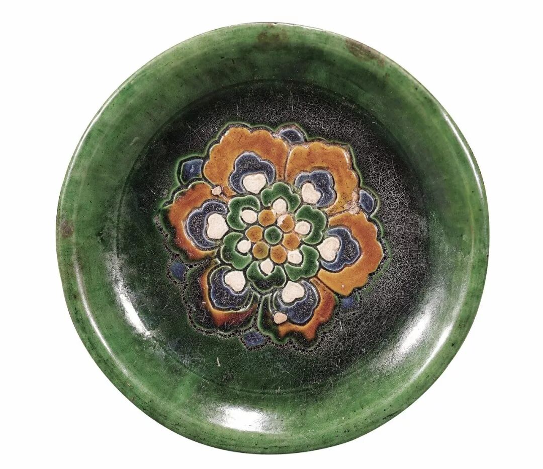 如三彩弦纹折腹碗,此件折腹碗通体点黄、绿彩,间隔露白斑点。其中瓷器上的白斑点的处理方式是借鉴了染撷中的“防染”工艺,即在施釉前,按事先设计好的构想在胎体表面以散点式留出空白,并以瓷土或蜡封住空白点,然后再浇釉或点釉。这样处理之后,在器物烧成过程中由于受到阻挡,彩釉无法流淌、进入留白处,从而形成“白斑加彩”的效果。