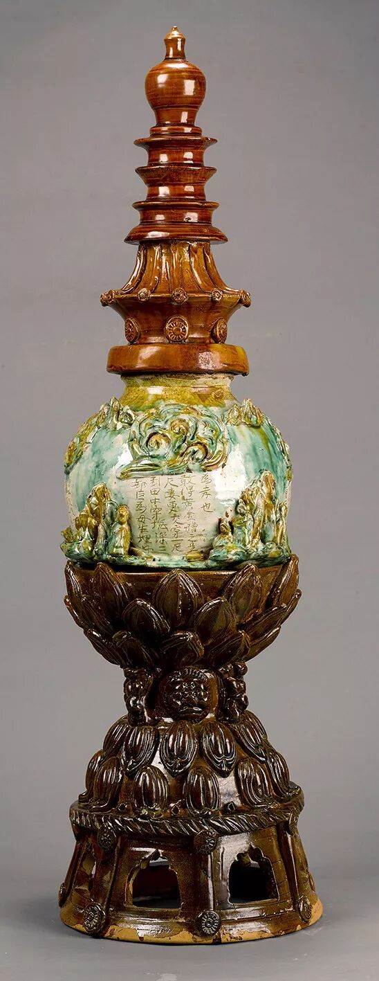 这一环节还有一部分展示的是唐人对死亡的看待方式,无论是传统的儒教、道教,还是中国化的佛教,对死亡的看待方式都十分谨慎,唐时三教发展,厚葬流行一时。如绘制有孝子故事的三彩贴塑莲花座孝子故事塔式罐,塔罐整体分塔座、罐身(塔身)、塔顶、塔刹四部分,且可拆卸,器物通高84厘米。塔座为赭褐釉莲花托座,有7组镂空壶门,且有仰、覆莲瓣、贴塑兽面、力士、圈饰边等装饰。罐身整体施黄、绿玻璃釉,留白熔融成多色阶变化,罐体有莲瓣花纹装饰,腹部捏贴隔带凸棱,凸棱上贴塑山石人物4组,人物写意,仅见轮廓,旁陈琴、匣、铲、桶等物,并刻文字4组。文字内容分别为“董永卖身”“曾子抚琴”“郭巨埋子”“曾子济水”等孝子故事。