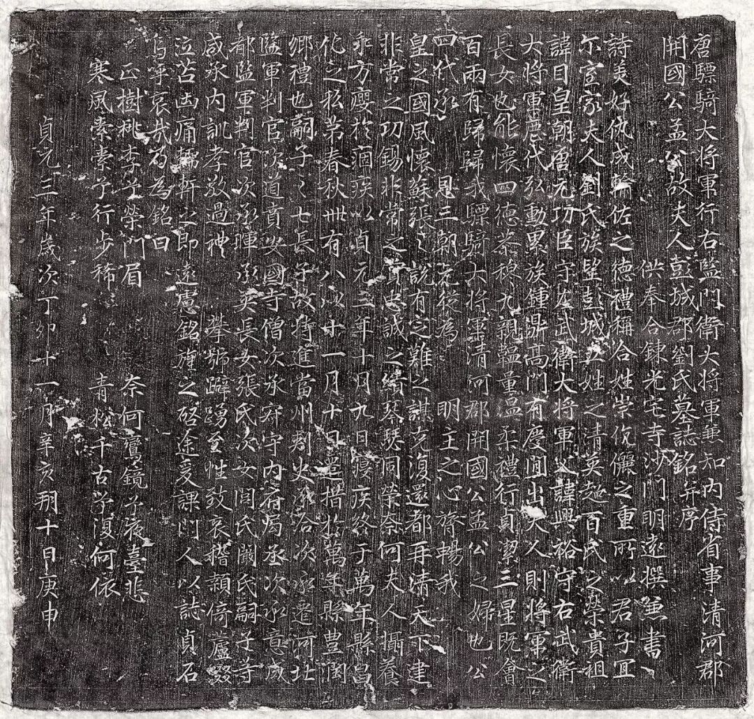 另一件是“贞元三年”款光宅寺沙门明远书刘氏墓志铭。此志落款为贞元三年(787年)十一月,由光宅寺沙门明远亲自撰写。亡者为唐骠骑大将军行右监门卫兼知内侍省事大将军清河郡开国公孟公夫人彭城郡刘氏。值得关注的是刘氏嗣七子,其中三子道贲为安国寺的僧人,这也很可能就是世俗人家能请到光宅寺明远写墓志的主要原因。墓志铭中的“光宅寺”建造在唐长安城的光宅坊内,寺址位于今西安火车站内西侧。该寺建于唐高宗仪凤二年(677年)。此外墓志铭的书法也值得关注,墓志铭的书法模仿王羲之的“兰亭体”行云流水、秀美俊逸,墓志所书17个“之”字,如《兰亭集序》一般,无一雷同,是不可多得的唐朝书法精品。