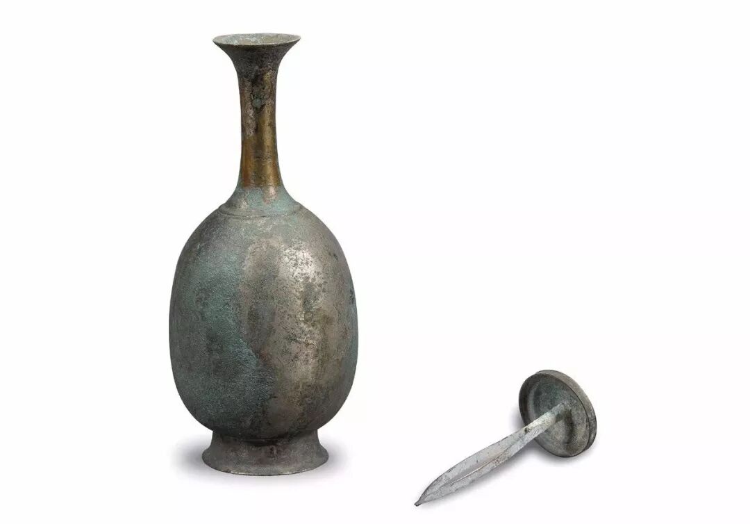 长沙窑青釉褐彩双系“荼瓶”款壶稍显朴素,此壶通体施青灰釉,釉不及底,底部划刻有“荼瓶一口,计钱壹拾五押”。由此可知,这件双系壶在唐朝作为茶瓶使用,并售卖“十五”钱。