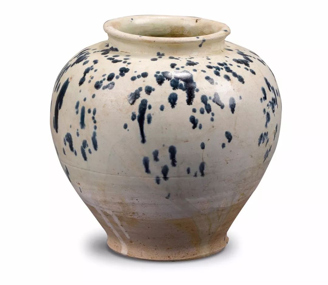 除了通体施加蓝釉的器物,还有点洒蓝釉器物。白釉蓝彩划花人物故事纹罐,器物口外卷,圆腹,罐唇口有三个支烧点。通体施白釉,底足无釉,淋洒蓝釉斑点装饰。罐肩位置刻划两个人物头像,疑为中国传统戏曲中的“丑”“末”角色。“丑”,多扮演滑稽人物,鼻梁上饰以白粉;“末”,扮演中老年男性角色。