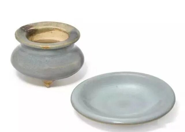 宋/元 钧窑天蓝釉小盘及钧窑天蓝釉紫斑三足炉