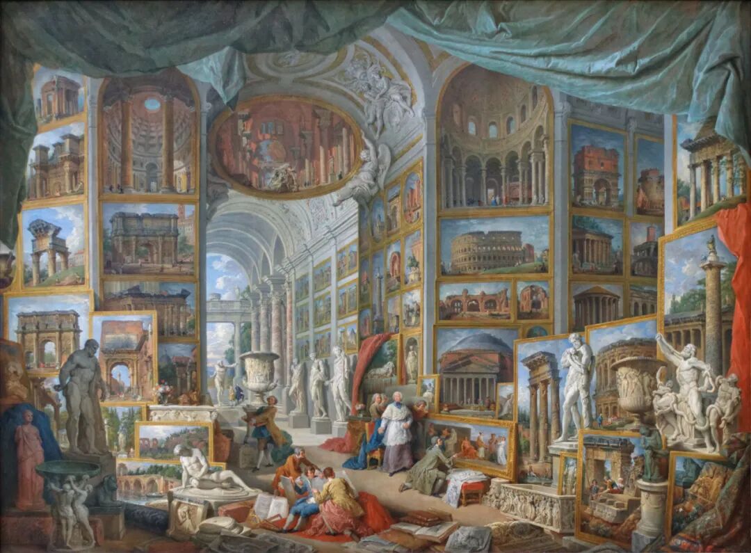 ▲青铜雕塑《拉奥孔及其子群像》(1520-1525)十八世纪意大利画家帕尼尼(Giovanni Paolo Panini,1691-1765)以擅长描绘罗马古物著称。在他的名作《古罗马景观画廊》(1758)中,画面右下角,我们也可以看到那座“举火烧天”的拉奥孔像:![]()