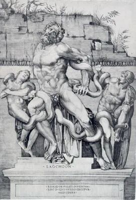 1506年,在罗马埃斯基林尼禄金宫遗址的葡萄园内,这座雕像重见天日。此后,热爱艺术品收藏的教宗儒略二世(Iulius PP. II,1443-1513)立即将其占为己有,并把它放到梵蒂冈的贝尔维德庭院中。意大利文艺复兴版画家马克·丹特(Marco Dente,约1486-1527)在这座古罗马雕塑被发现十余年后创作了一幅铜版画《拉奥孔》,真实表现了雕塑在1506年被发现时的状态——当时拉奥孔和他的儿子们的右手都是缺失的,主角拉奥孔的右臂甚至是齐根断掉的。![]()