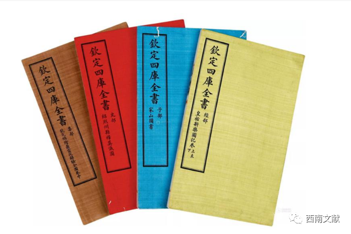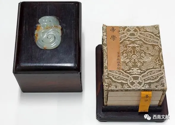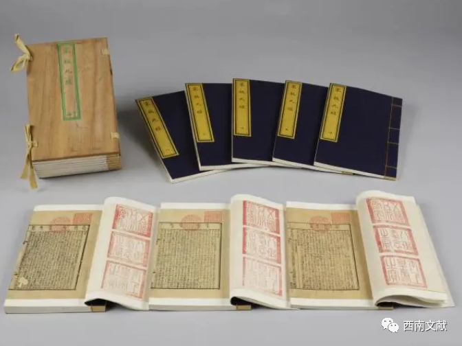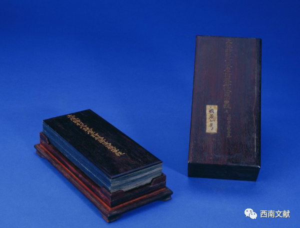 书匣多以盛装宋、元旧刻及精钞、精校珍本书籍。匣的形式和开启方法各有不同, 一般在一侧有便于抽开的活门,匣门上镌刻书名,亦填上颜色。函匣的制法,不用铁钉,只用卯榫交插,以鳔胶粘牢。函匣常常与夹板配合使用。文渊阁《钦定四库全书》每部以香枬木两片上下夹之,约以绸带,外用香枬木匣盛之。函的长宽完全相同,高低则随书的厚薄而制。《宛委别藏》780册,分装成103函,每函均盛以木匣,匣以红木为主,格式统一。匣的上面刻“宛委别藏”四个字,侧面匣门刻所镌之书名,字依四部分色:经部绿色,史部红色,子部灰色,集部白色,略仿《四库全书》体式。《天禄琳琅》书函的质料和颜色则根据各书的时代而加以区别:宋版、金版和影宋钞本皆函以锦;元版函以蓝色绨;明版函以褐色绨等。置于架几之上,尽可一目了然。![]()