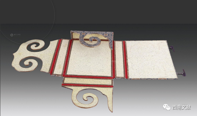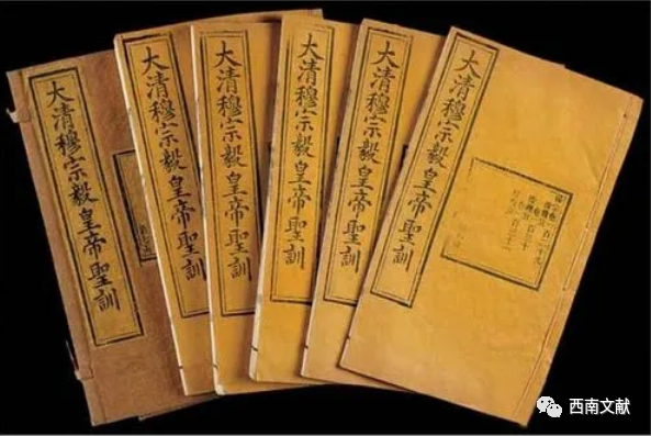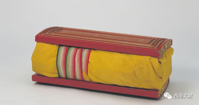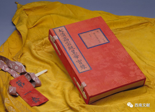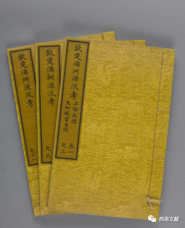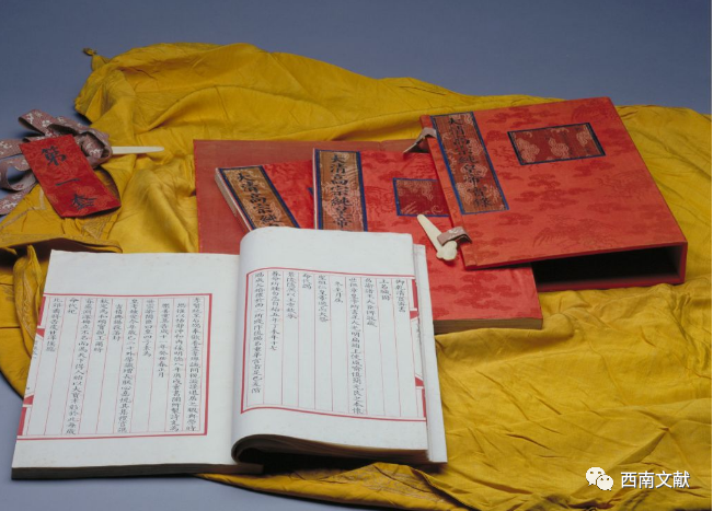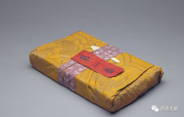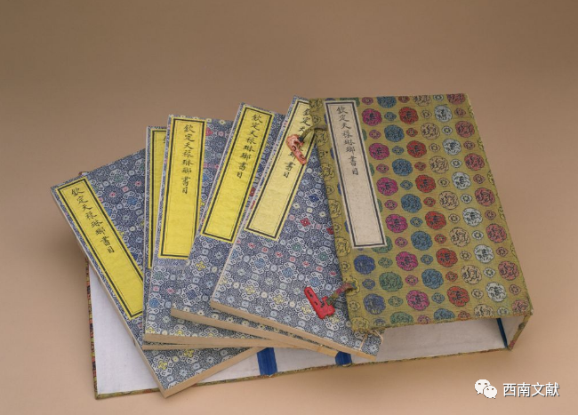 无论是线装,还是包背装、蝴蝶装和经折装,均为长方形状,左上方沿书口垂直贴一款长条状书签。一书内容较多者,则于长签旁加一方签,写明此册各卷细目。内府书籍均采用上好的纸张印制。主要有开化纸、太史连纸、将罗纸等。尤以开化纸洁白绵韧,质地细腻,无帘纹,并有白玉般温润之感,多为陈设本选用。对书叶版面的处理,一般都留有十分宽大的余地,板框之内,行格疏朗,字距相宜;版框之外,继承了中国古籍历来天大于地的传统,还绰有余裕。即便是书眉处写有批语和注解文字的书籍,在视觉上也毫无窘促的感觉。总之,各种书册整体设计简洁, 格调高雅,显出潇洒大方的气派。为了收藏的方便和美观,内府书籍全部配制了函套、书匣和书盒等保护性物品。它们由包裹卷轴书籍的书帙发展而来。《说文解字》谓:“帙,书衣也”。“书衣”即指包书的套子,故而“帙”又写作“袠”或“袂”。随着书籍从卷轴式演进到册页式,外面的附属品也相应地由“帙”变而为“函”。“函”的本意为包容、容纳,有如盒子。古代有所谓玉函、石函,都是用来盛装珍贵的物品或书籍。至清时,主要有包袱、函套、夹板、书匣四类。包袱类似“帙”,故仍有沿称“书衣”者。此时的包袱主要用来包裹经折装、包背装和线装等册装书籍。以方形为主,并有单、夹、棉之分,供配套使用。单独使用时,多为夹袱。清历朝《实录》和《圣训》均用金龙明黄夹袱,外以紫地白花锦带、本色云头牙签捆缚。![]()
